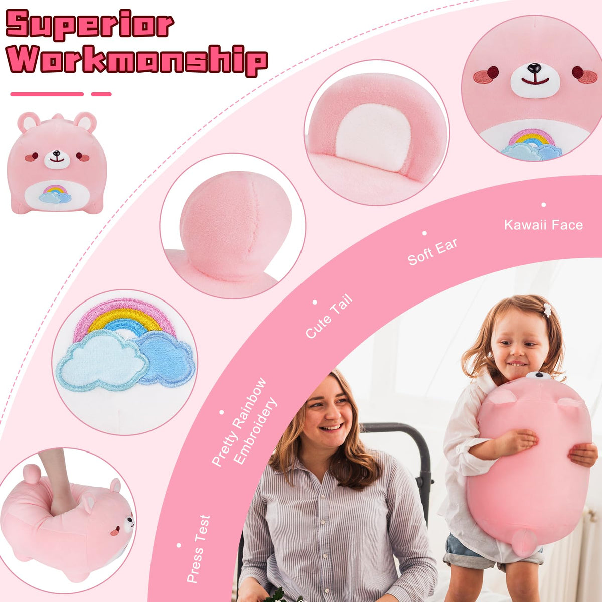 Product Name: Pink Bear Plushie. Material: Cotton. Product Size: 16 &Amp; 20 Inches. Product Weight: 0.33 Lbs. Products Include: 1* Pink Bear Plush&Nbsp; Features: 1. Cute Pink Bear Stuffed Animal Is Made Of Soft And Comfortable Material, It Has A Cute And Elastic Shape, And It Can Be Returned To Its Original Shape After We Knead And Press At Will. 2. Pink Bear&Nbsp; Pillow Is The Right Size, It Is Very Suitable For Children To Play, It Can Help Us Fall Asleep Quickly, Relieve Stress And Stay Happy. It Plays A Final Role In Our Lives. 3. Pink Bear Plush Have Cute Tails And Sweet Expressions. Its Soft And Skin-Friendly Properties Make It The Perfect Birthday Gift For Kids, Friends And Colleagues.