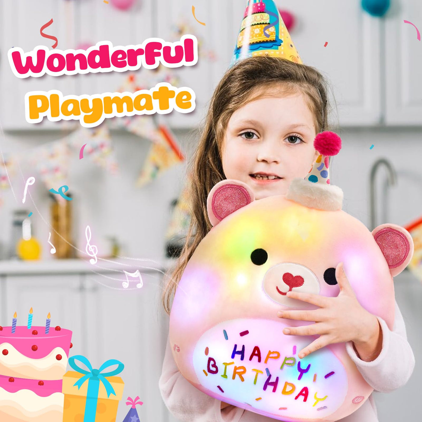 Bstaofy Light Up Music Happy Birthday Teddy Bear Soft Plush Pillow Birthday Stuffed Animal Bear Birthday Gift For Toddler Kids Girls, 14'