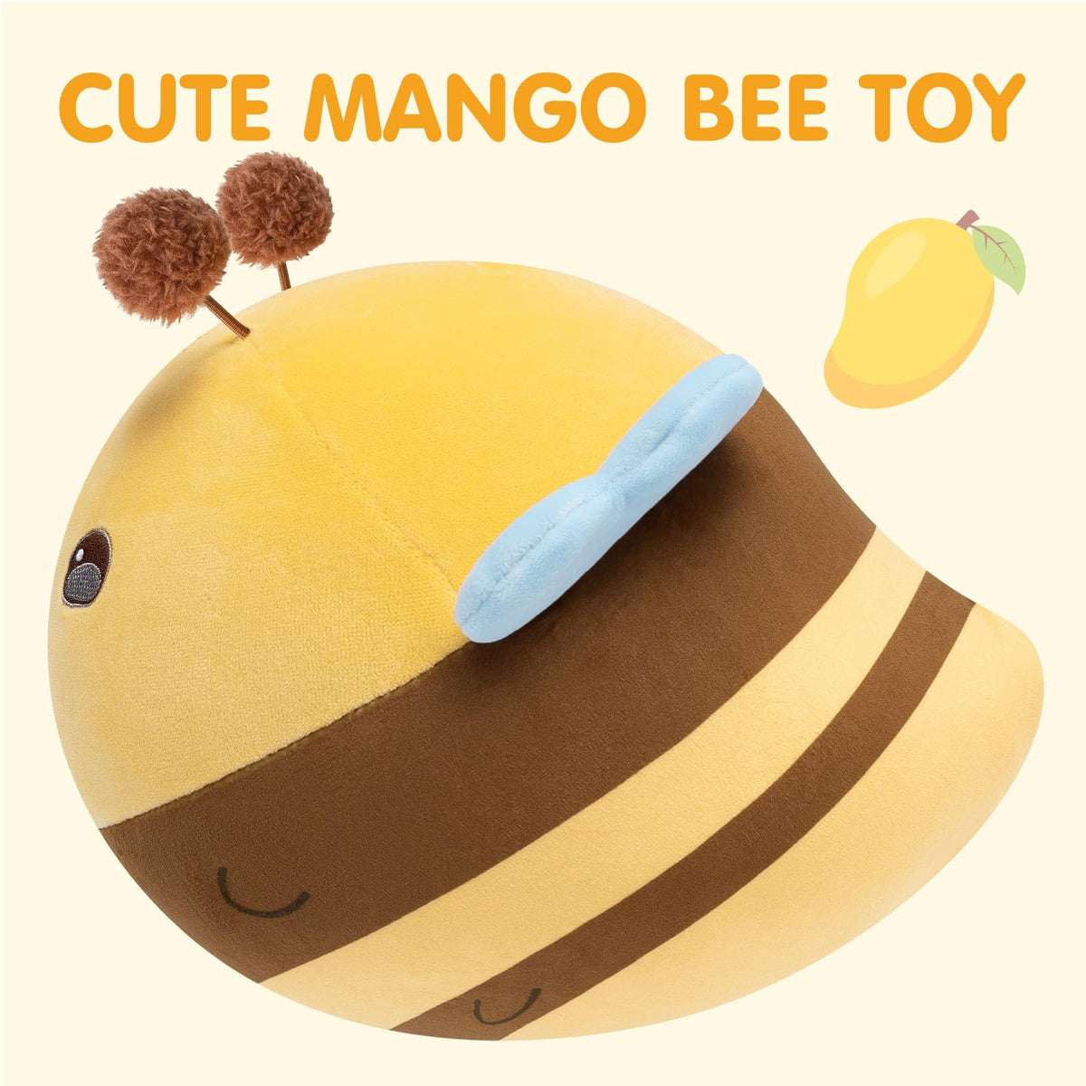 Q: What are the dimensions of the mango bee plush pillow?A: The mango bee plush pillow measures approximately 8.0 inches in length and 6.3 inches in width, making it a compact and portable toy that is easy to carry and store.