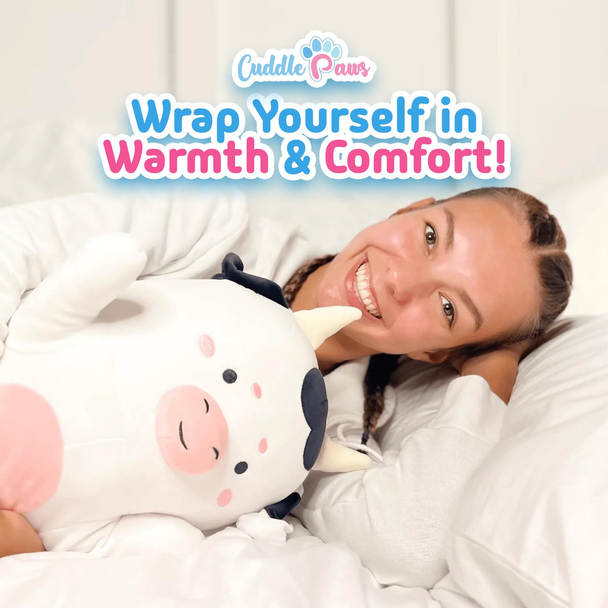 Q: Is the Cuddle Paws Cow Pillow suitable for use as a body pillow?A: Yes, the Cuddle Paws Cow Pillow is perfect for use as a body pillow. Its large size and plush design provide excellent support and comfort, whether you're lounging, napping, or watching TV.