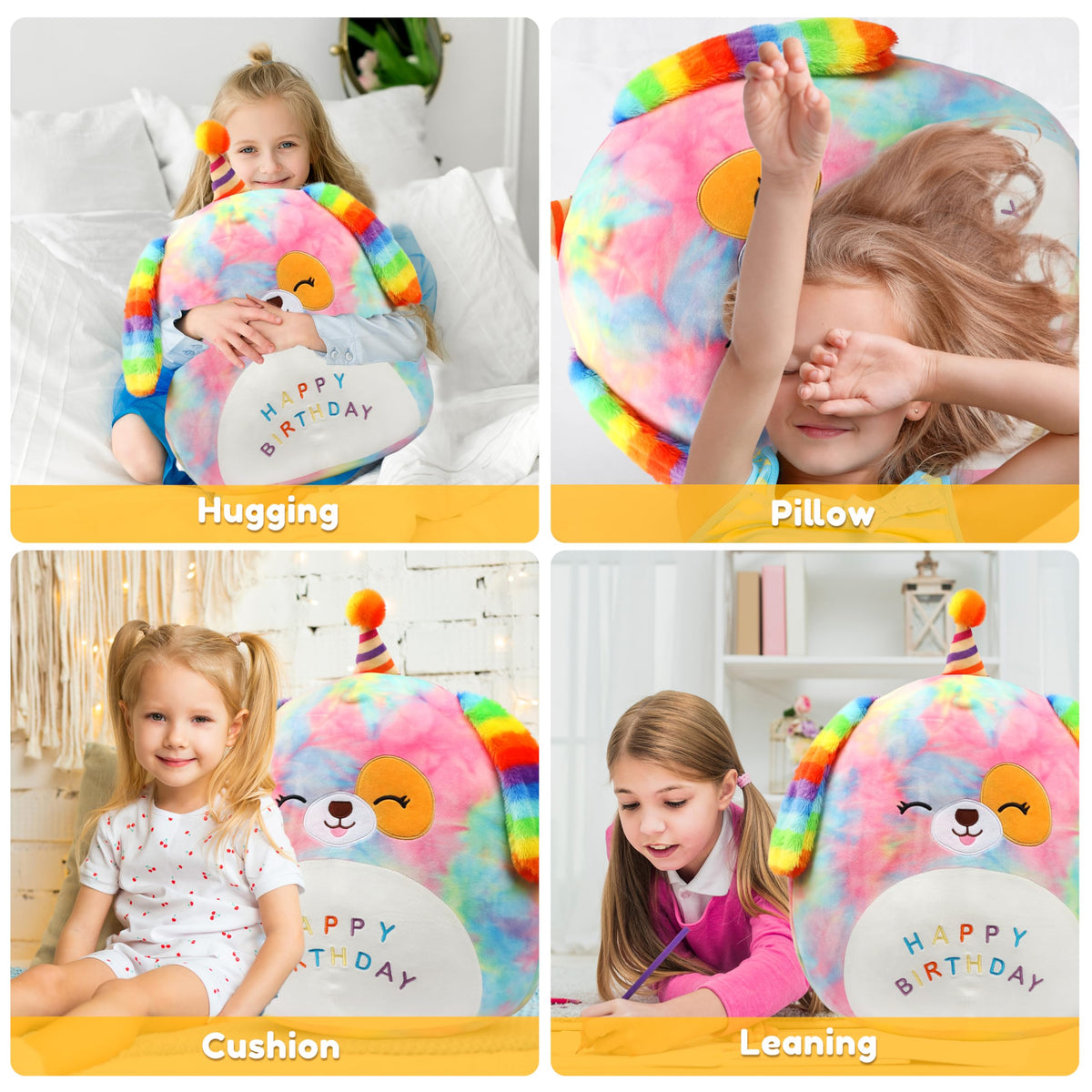 This Large Rainbow Birthday Dog Plush Pillow Is Filled With Pp Cotton, Very Soft And Flexible,It Is A Good Choice When You Attend The Birthday Party Of Your Children And Friends.It Will Make The Children Feel Especially Happy To Spend Their Birthday Time.