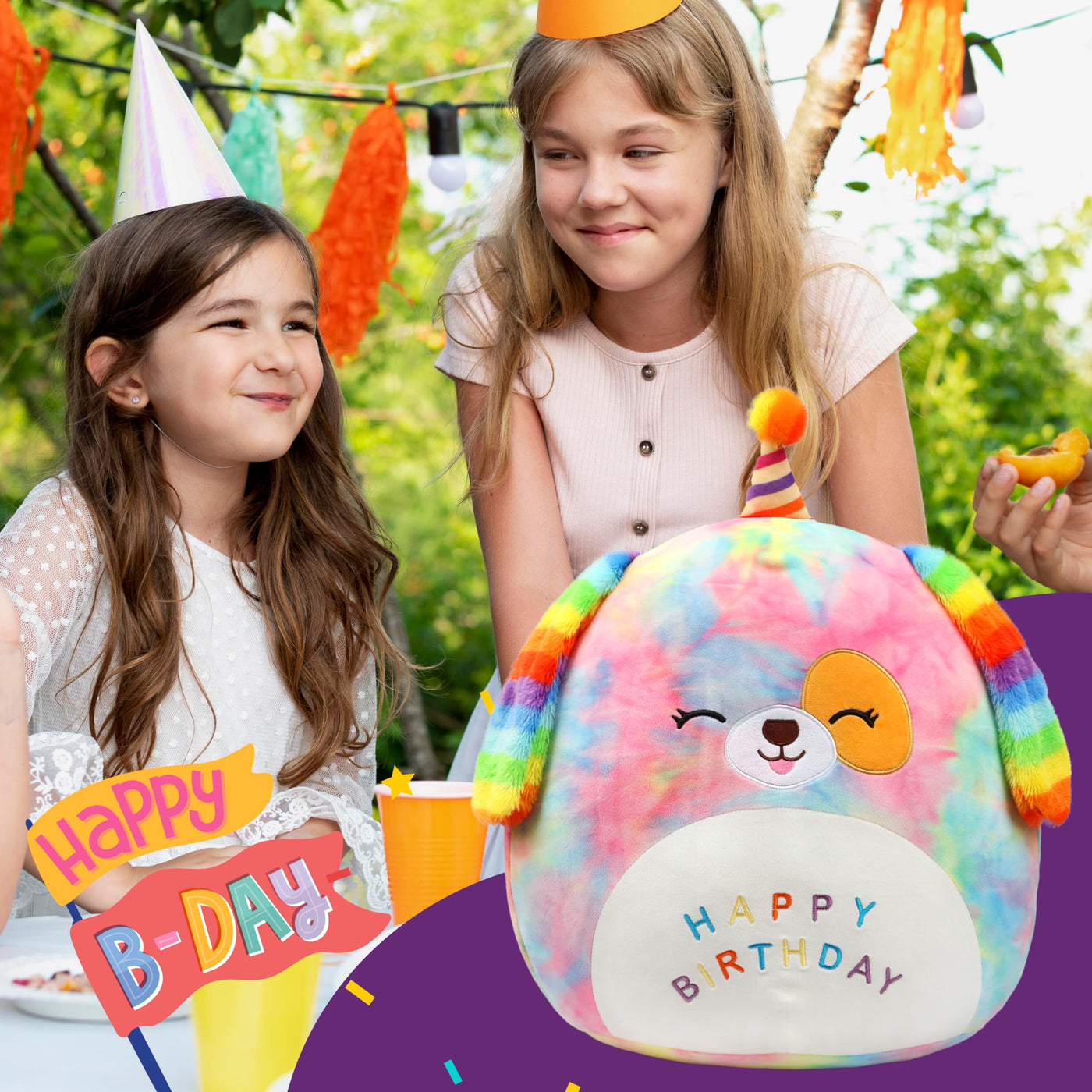 Q: What makes this plush pillow a great gift for birthdays?A: This plush pillow features a unique rainbow design, a colorful birthday hat, and the embroidered words 'HAPPY BIRTHDAY,' making it a perfect birthday surprise that adds joy and creates memorable moments for kids.
