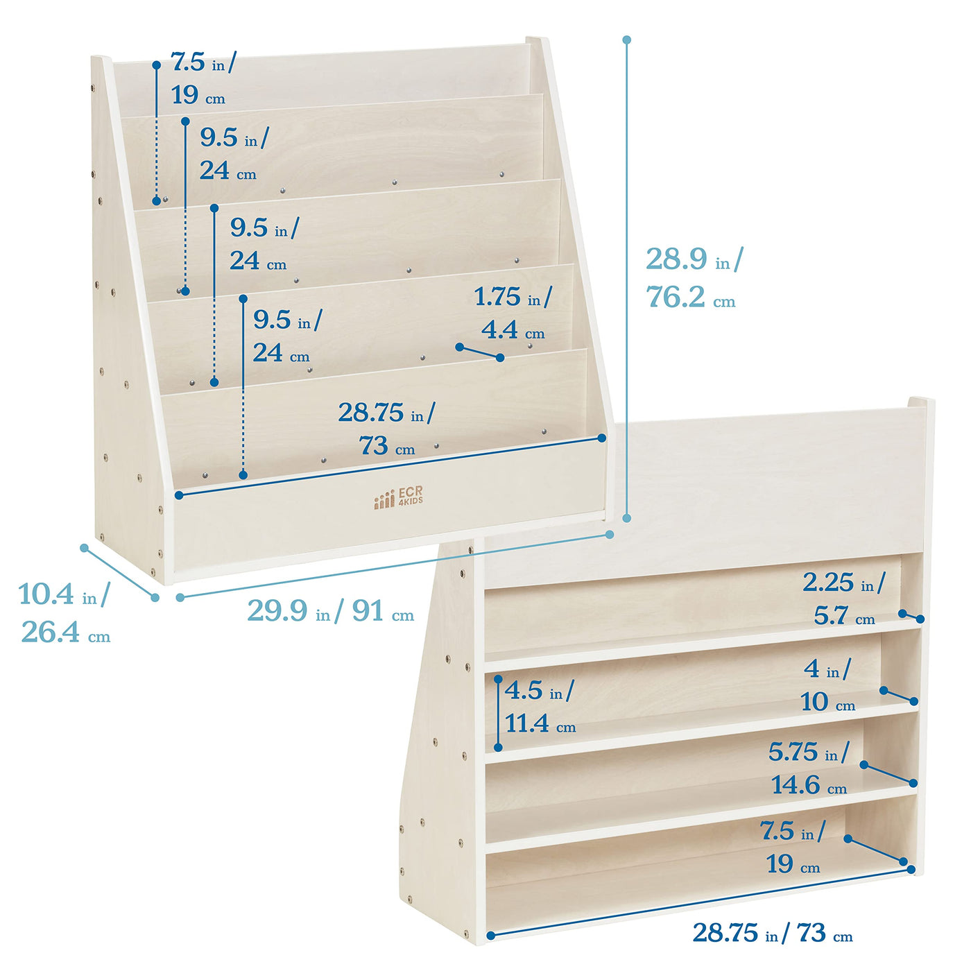Create a library and a love of reading with ECR4Kids Birch Streamline Book Display. Children’s book stands are a great way to introduce literacy at a young age in daycares, preschools, and at home. Designed to grow with little ones, this bookshelf helps parents and educators provide exposure to literature while staying organized. Instilling consistent reading routines in children helps develop their interests and cultivate a passion for learning. The five forward-facing shelves are deep to provide ample storage to display and store all your child’s books, magazines, and other literature. The tiered display keeps stories forward-facing with covers visible allowing children to select their favorite book confidently and clean up when story time is over. The streamlined design can be used against a wall or as a play space partition utilizing the four shallow shelves on the back for small toys. Constructed from sustainably harvested birch plywood with a durable finish sealing the wood surface and resisting scratching. A UV inhibitor helps furniture resist ultraviolet light and yellowing. Natural birch plywood is extremely durable and will hold up to everyday use in early childhood environments. Pair with ECR4Kids Birch Furniture to complete the set, sold separately.