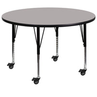 This Round Activity Table is a must have for daycare, preschool and early childhood development centers. Enhance collaborative learning by grouping tables together. It will accommodate children up to age 7.It features a 48' high pressure scratch, stain and warp resistant laminate top with a black edge band and 16 gauge tubular steel legs for increased stability. The top incorporates a protective underside backing sheet to prevent moisture absorption and warping. An attractive black powder coated finish protects the upper legs from scratches and height adjustable chrome lower legs give you the flexibility to raise or lower the table a full 9' in 1' increments. Casters allow you to easily move the table around and then lock into place.Perfect for craft time, snack time and party time, this easy to clean table is just the right size for small children.