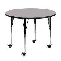 The Round Activity Table is a versatile option for school classrooms, corporate training centers and your home. Enhance collaborative learning by grouping tables together. It will accommodate children of all ages, from 1st grade to adult.It features a 48' high pressure scratch, stain and warp resistant laminate top with a black edge band and 16 gauge tubular steel legs for increased stability. The top incorporates a protective underside backing sheet to prevent moisture absorption and warping. An attractive black powder coated finish protects the upper legs from scratches and height adjustable chrome lower legs give you the flexibility to raise or lower the table a full 9' in 1' increments. Casters allow you to easily move the table around and then lock into place.This activity table provides a durable work surface for anything from computer labs to project meetings to laying out fabric in your sewing room.