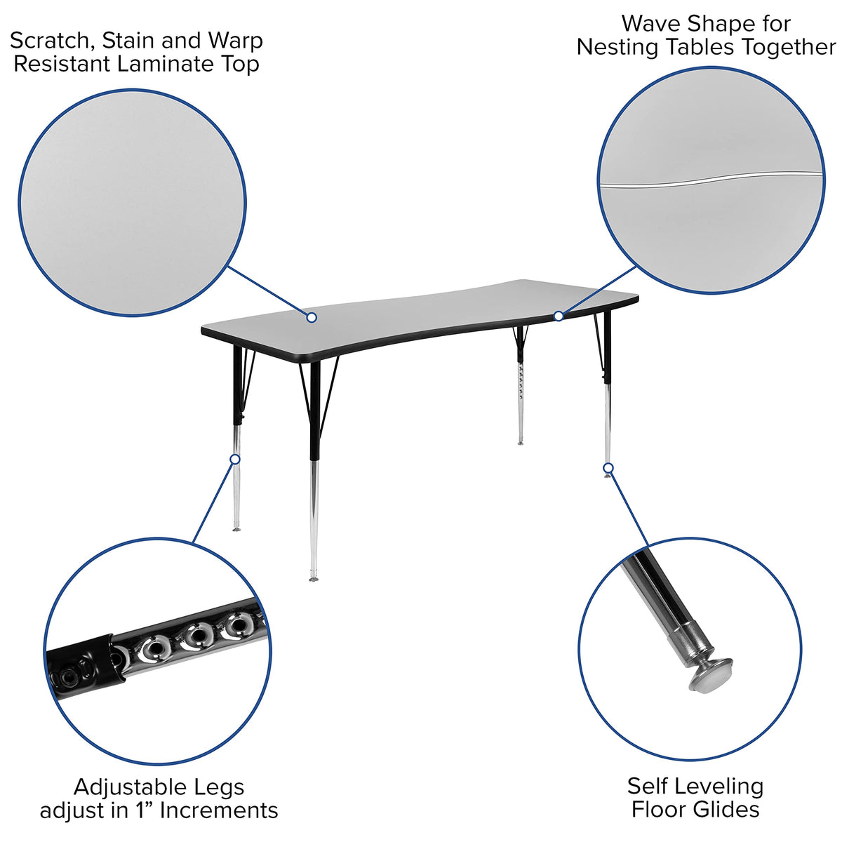 Prepare for a new year by incorporating these modern flexible learning table sets in your classroom that are designed to encourage all students to participate in group learning. You can create unlimited combinations using various shapes and colors. With our ergonomic shell student chairs included there is no need to shop around.Practical for any class setting this school table group will last you for many years with its durable thermal fused laminate top that is scratch, stain and warp resistant. Height adjustable chrome lower legs give you the flexibility to raise or lower the table. Self-leveling nylon floor glides keep the table from wobbling and protect your floor by sliding smoothly when you need to move it.Purchase our pre-built table and chair bundle for your classroom, home, rec center, or other public gathering facilities. The plastic stack chairs with 18' seat height are ideal for middle, high school and college students. You can create a flexible learning workspace out of your conference room to grow work relationships by having teams meet regularly in a group setting.