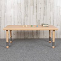 Amplify any classroom or playroom with the functionality and convenience of the Flash Furniture Adjustable Activity Table. This versatile plastic activity table offers endless possibilities in your home or classroom and is great for learning, playing, arts and crafts, meal time, homework, and much more. Featuring sturdy adjustable legs, this classroom table gives you the flexibility to raise or lower its height to accommodate kids and toddlers up to the age of 7. It comfortably seats up to 6 children with plenty of room between each child and can be paired with 6 vibrant stackable school chairs with a seat height of 6.5' to 14'. Convenient plastic floor glides on the bottom of each leg help protect flooring surfaces from damages when you need to move the activity table around the classroom. Made with a 1.5' thick textured top with plastic safety rounded corners, this children's activity table helps prevent injuries, and the neutral tone allows children to stay focused on their learning assignments. The rectangular activity table measures 24'W x 48'D x 14.5-23.75'H and is applicable in the home and school environments, making it perfect for classrooms, playrooms, dining rooms, kids bedrooms, daycares, and preschools. After a day of messy arts and crafts or school art projects, the low-maintenance classroom activity table can be wiped down with a damp cloth for quick and easy cleaning.
