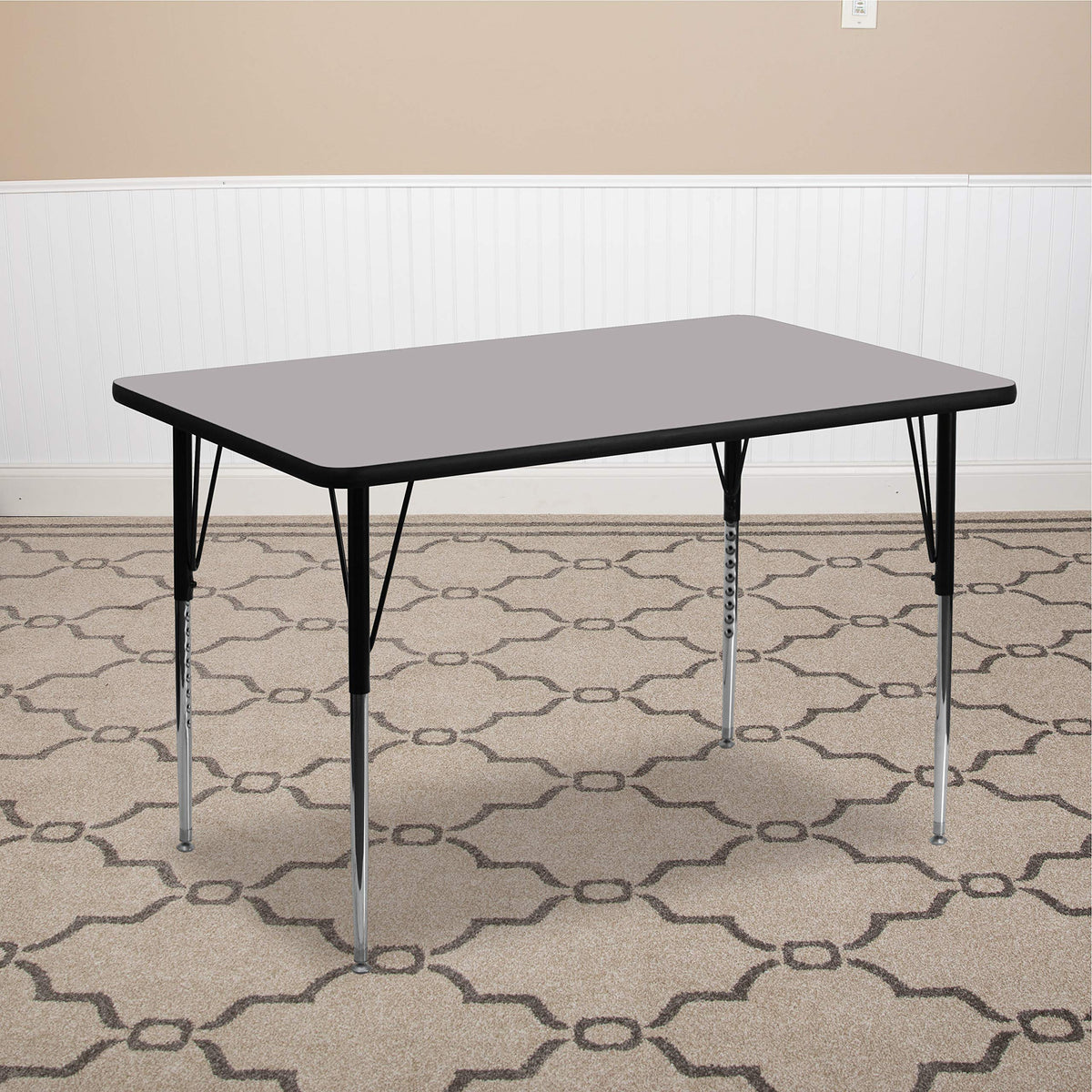 If you have a multi-use facility that hosts many assorted activities, this rectangular, adjustable height activity table is a versatile option and can save you money. With no need to buy different tables for different users, this table is ideal for school classrooms, corporate training centers and your home. Enhance collaborative learning by grouping tables together. It will accommodate children of all ages, from 1st grade to adult.It features a 30"W x 48"L thermal fused scratch, stain and warp resistant gray laminate top with a black edge band and 16 gauge tubular steel legs for increased stability. The top incorporates a protective underside backing sheet to prevent moisture absorption and warping. An attractive black powder coated finish protects the upper legs from scratches and height adjustable chrome lower legs give you the flexibility to raise or lower the table a full 9" in 1" increments. Self-leveling nylon floor glides keep the table from wobbling and protect your floor by sliding smoothly when you need to move it. This activity table provides a durable work surface for anything from computer labs to project meetings to laying out fabric in your sewing room.