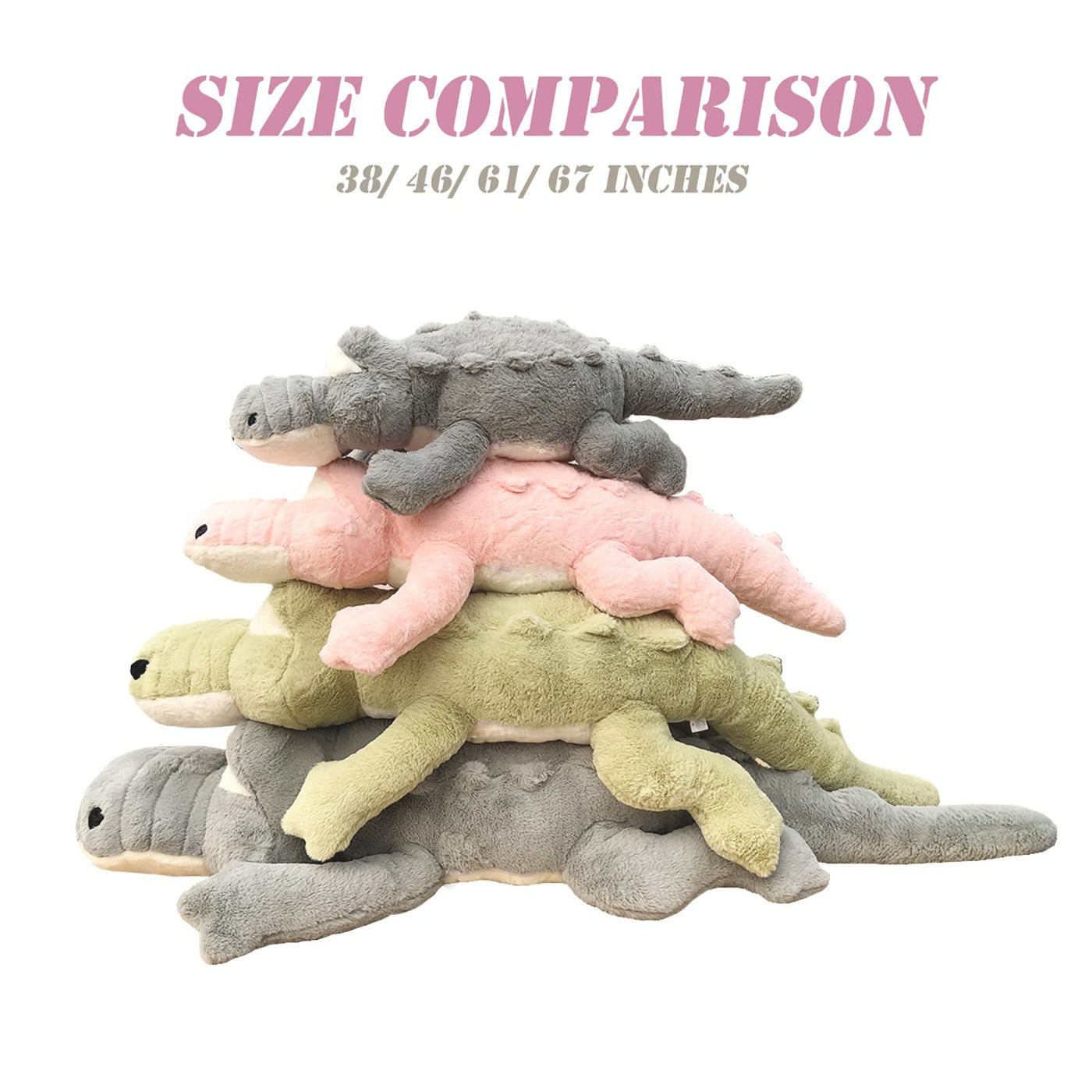 Q: What is the size of the Hofun4U Crocodile Plush Pillow?A: The Hofun4U Crocodile Plush Pillow measures 67 inches in length, making it a giant stuffed animal suitable for hugging or as a body pillow.