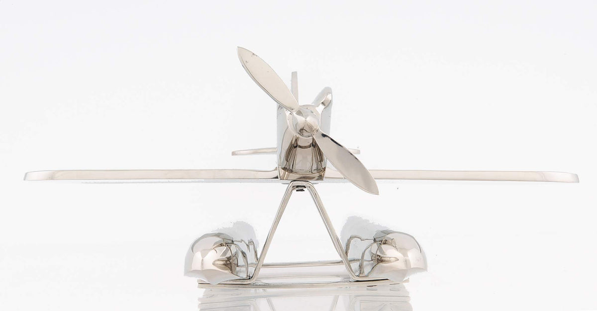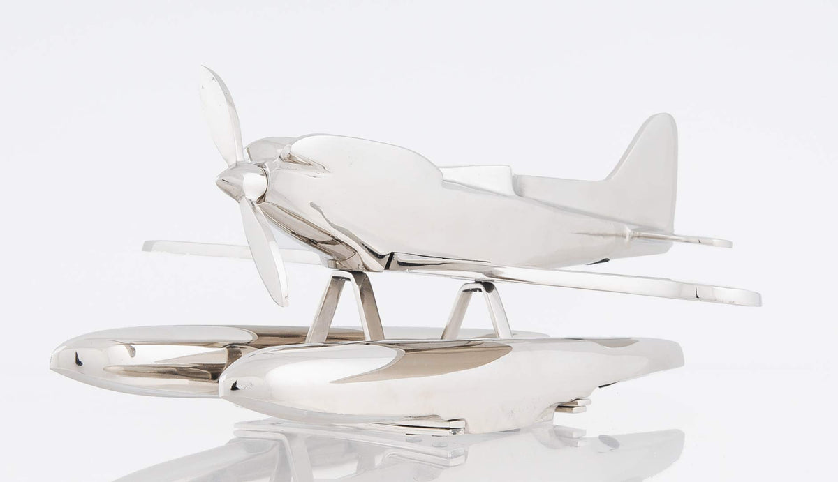 A flying machine that could breeze through the clouds but also cruise along the shore became an innovative reality early in the 18th century. This aluminum seaplane will build rapport on the office desk or make a glistening decorative piece in the home. '? Made out of aluminum with a shiny nickel finish '? Propeller spins