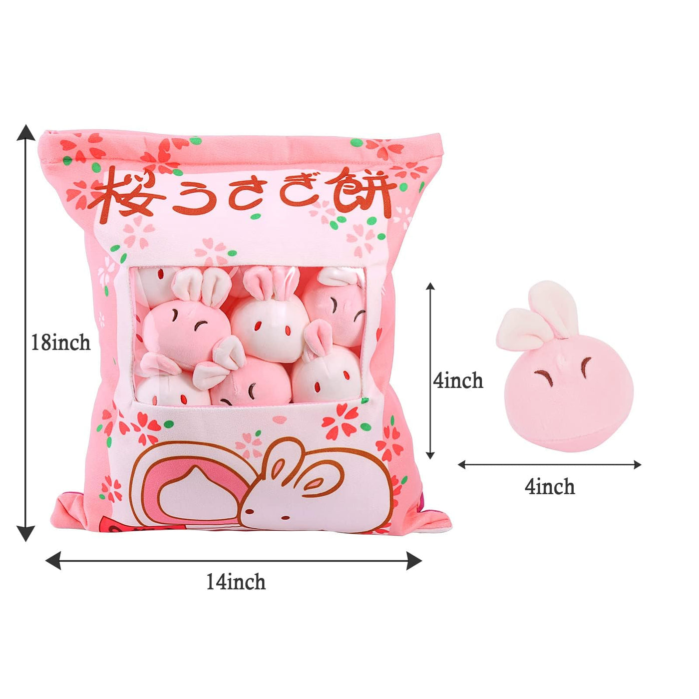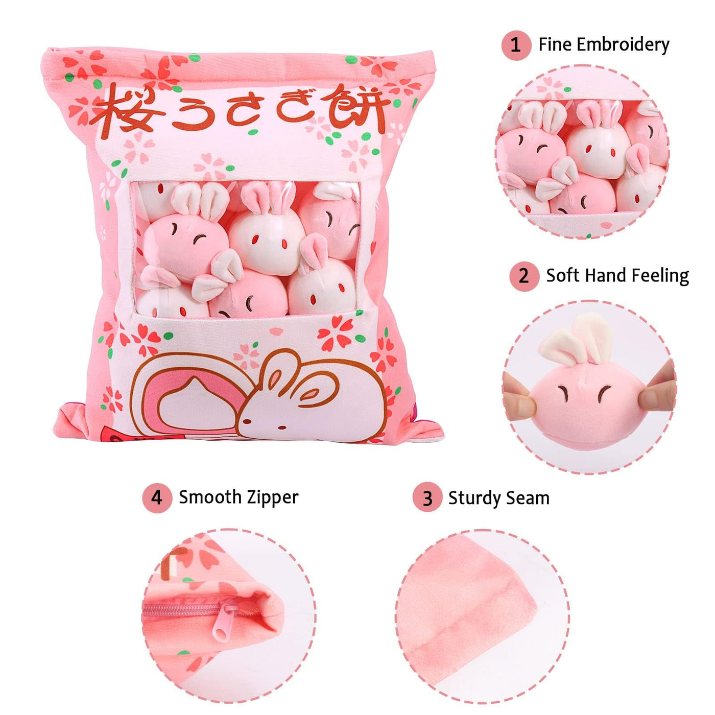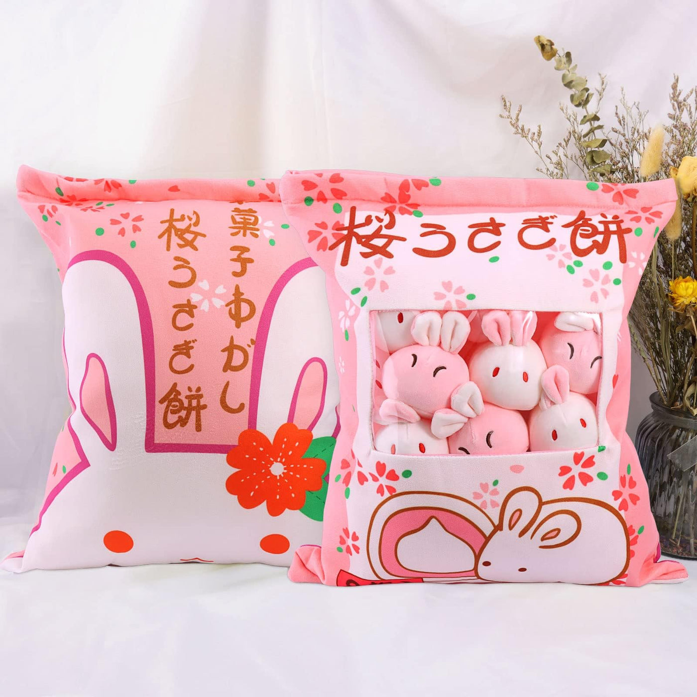 Q: What unique features does the JILPAK Kawaii Bunny Plush Pillow offer?A: The JILPAK Kawaii Bunny Plush Pillow features a 2-in-1 design that includes a soft throw pillow with 8 small stuffed bunny plush dolls inside. This makes it a versatile item for both comfort and fun.