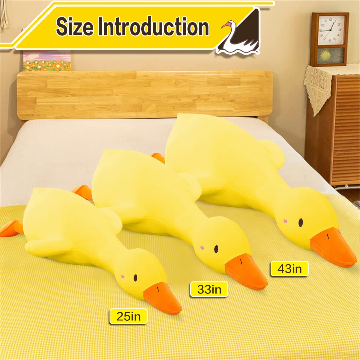 Q: What sizes are available for the Kewo Duck Plush Pillow?A: The Kewo Duck Plush Pillow is available in three sizes: 25.5 inches, 33.4 inches, and 43.3 inches, allowing you to choose the perfect size for your needs.
