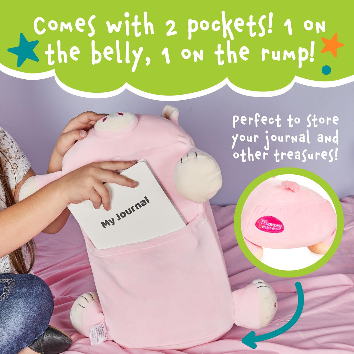 Q: Can children store items in the MEMORY MATES pillow?A: Yes, the MEMORY MATES pillow features a belly pocket designed to hold a lined diary and other treasures, as well as a back pocket for storing keepsakes.