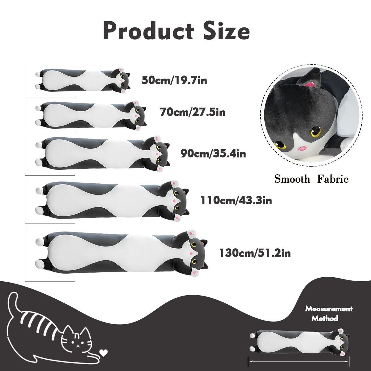 Q: What sizes and colors are available for this cat plush pillow?A: The cat plush pillow is available in multiple sizes, including 19.7 inches, 27.5 inches, 35.4 inches, 43.3 inches, 51.1 inches, and 59 inches. It comes in several colors, including yellow, black, gray, and pink.
