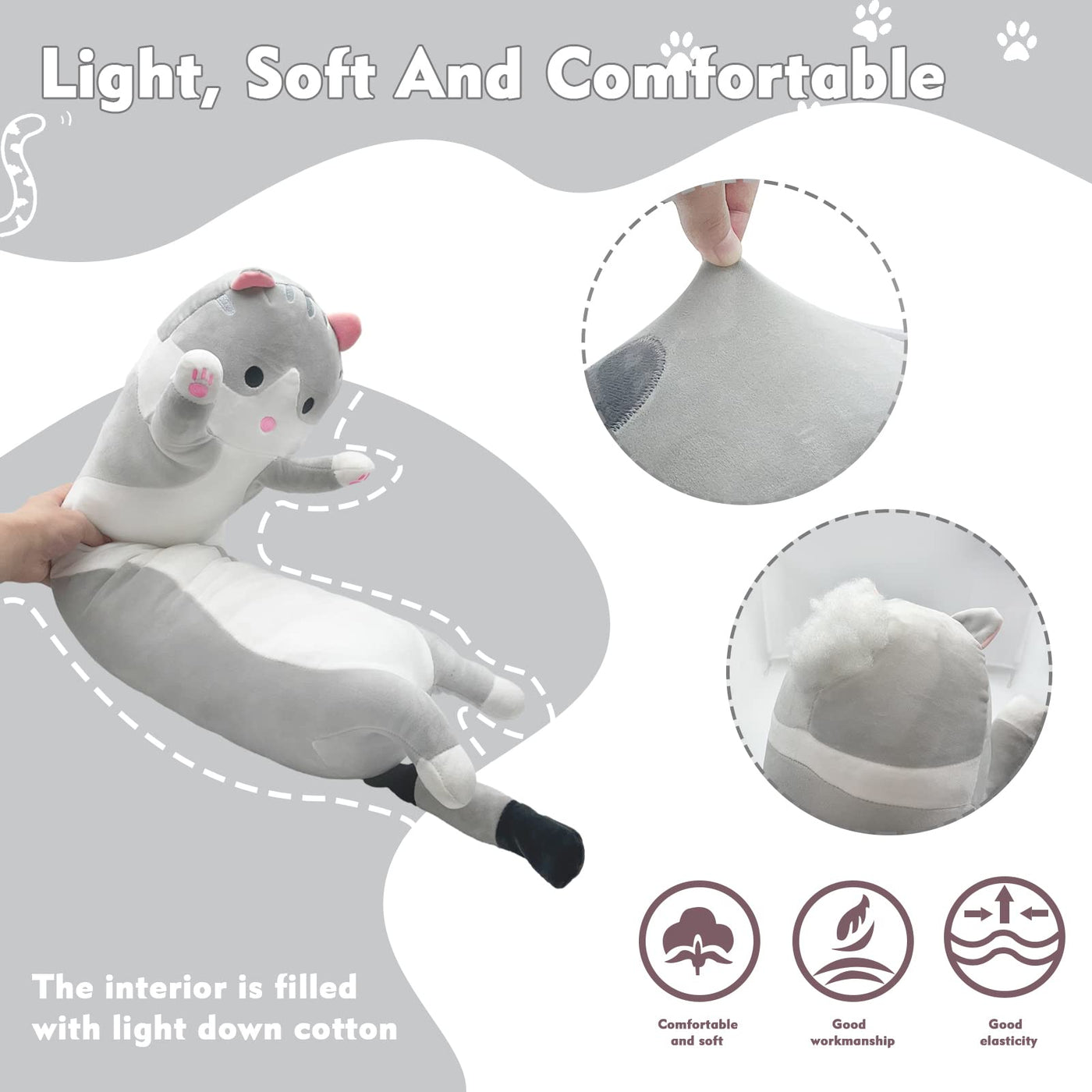 Nxnynz Long Cat Plush Pillow, 27.6In Cute Cat Plushie Stuffed Animals Body Pillow, Grey Kawaii Kitten Soft Plushie Doll Toy Birt