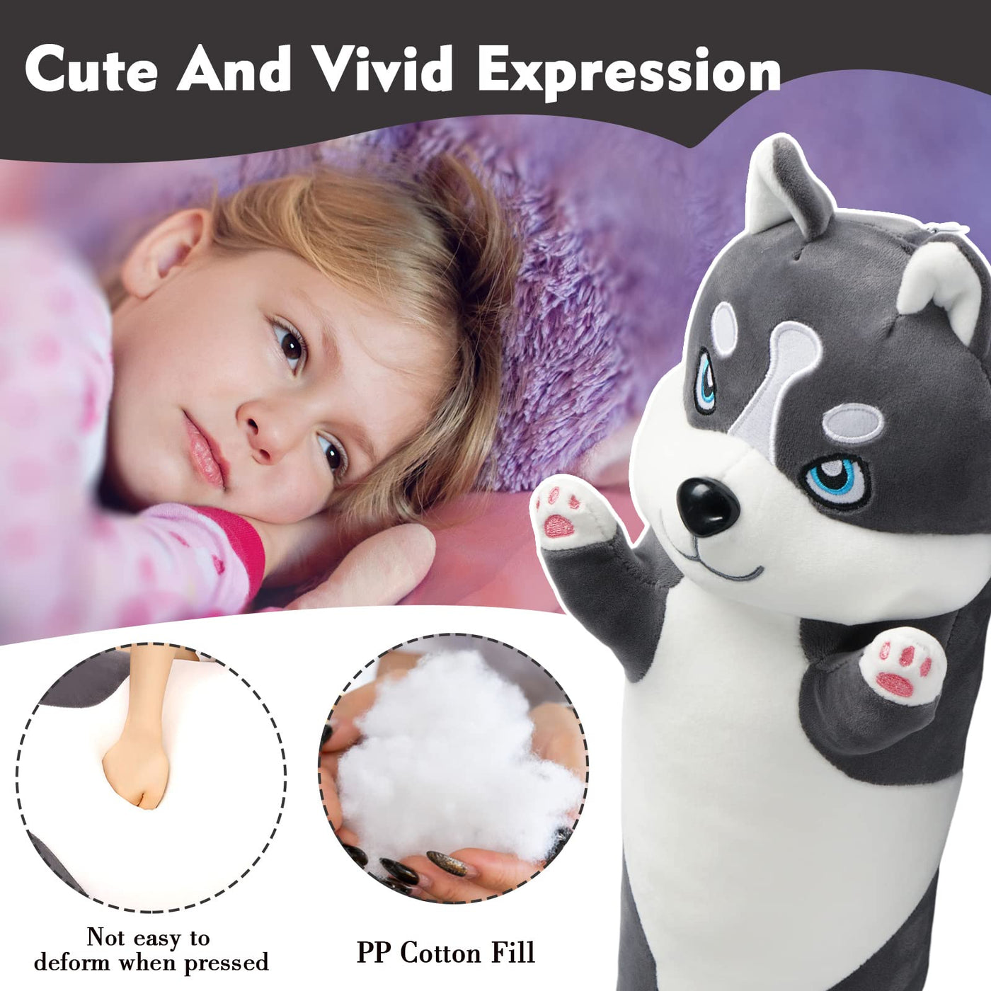 Nxnynz Long Plush Dog Stuffed Animal Apply To Children Adults,Which Provide Our Kids With Full Sense Of Security, Gently Accompany With Their Growth.Is Also Make You Feel Secure Do Not Lonely Especially When You Watch A Horror Movie On Night Or Have Insomnia.How To Keep It'S Cute?When You First Receive It, It May Be Not Very Fluffy Because The Husky Is Packed In A Lovely Compressed Bag:1. Use Your Hand Smooth Its Plush And Adjust The Fillers Position ;2. Exposure It In The Sun Or The Floor A Few Hours;3. Pat The Dog Gently To Make It Fluffy.4. Put It In The Dryer For Light Circulationkindly Remind:1. Machine Washing Is Not Recommended. If The Dog Is Soiled A Little, Just Wipe It With A Hygienic Towelette.2. If You Really Want To Machine Wash, Be Sure To Put It In A Laundry Bag And Choose A Light Delicate Cycle Mode.3.Bleach And Ironing May Damage This Husky