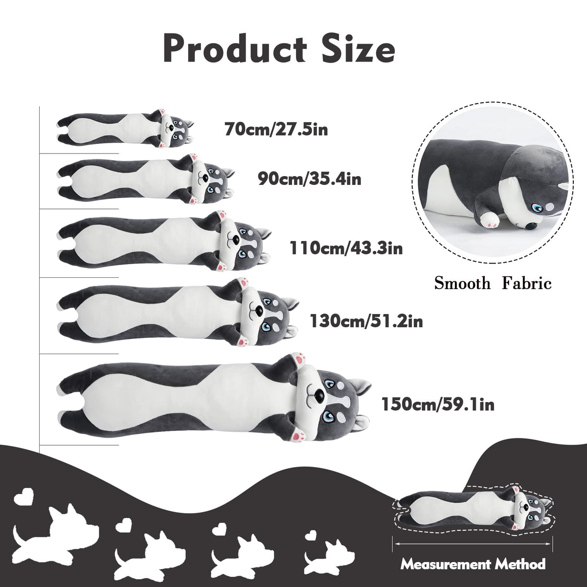 Q: What is the size of the NXNYNZ Long Husky Plush Pillow?A: The NXNYNZ Long Husky Plush Pillow comes in multiple sizes, including 27.6 inches, 35.4 inches, 43.3 inches, 51.1 inches, and 59 inches, allowing you to choose the perfect size for your needs.