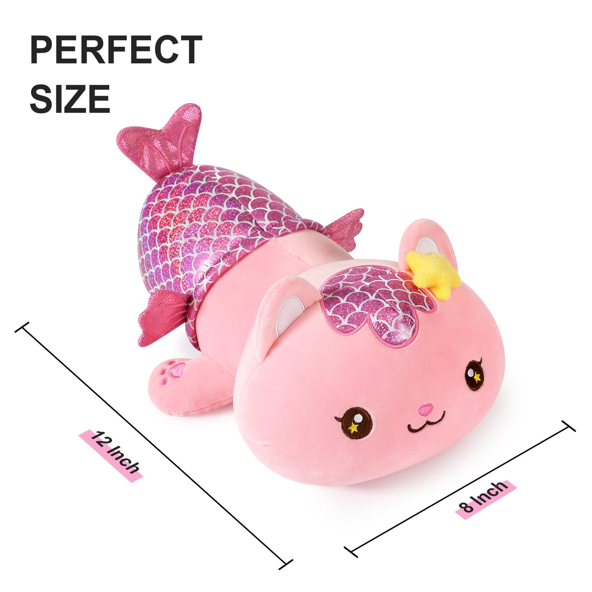 Q: What are the dimensions of the plush pillow?A: The Onsoyours Cute Kitten Mermaid Plush Toy measures 12 inches, making it the perfect size for kids to hug, cuddle, and snuggle with on beds or couches.