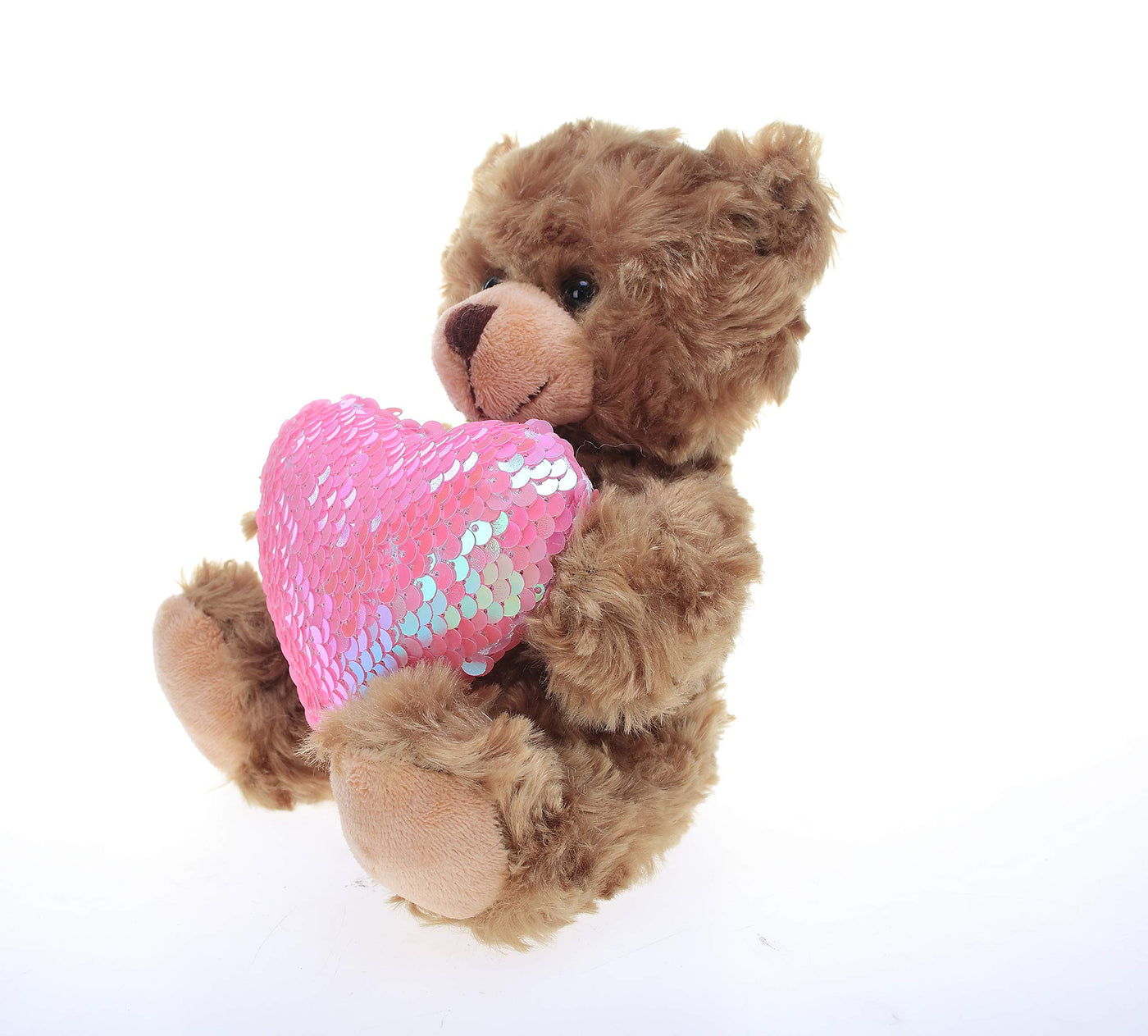 Q: What is the size of the Plushland Stuffed Mocha Heart Bear?A: The Plushland Stuffed Mocha Heart Bear measures 6 inches, making it a convenient size to fit in a nursery crib, baby bag, or on a work desk.