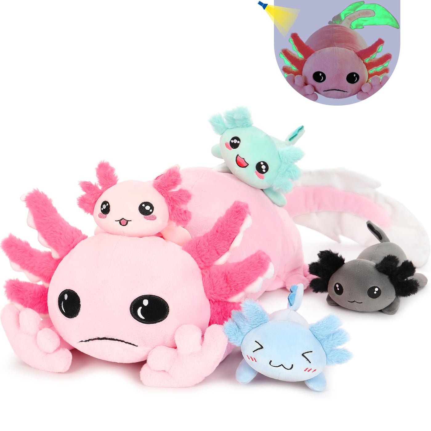 Tezituor Giant Mommy Axolotl Stuffed Animal With 4 Babies Inside, 31.5' Soft Realistic Axolotl Plush Pillow Toy Luminous Squish