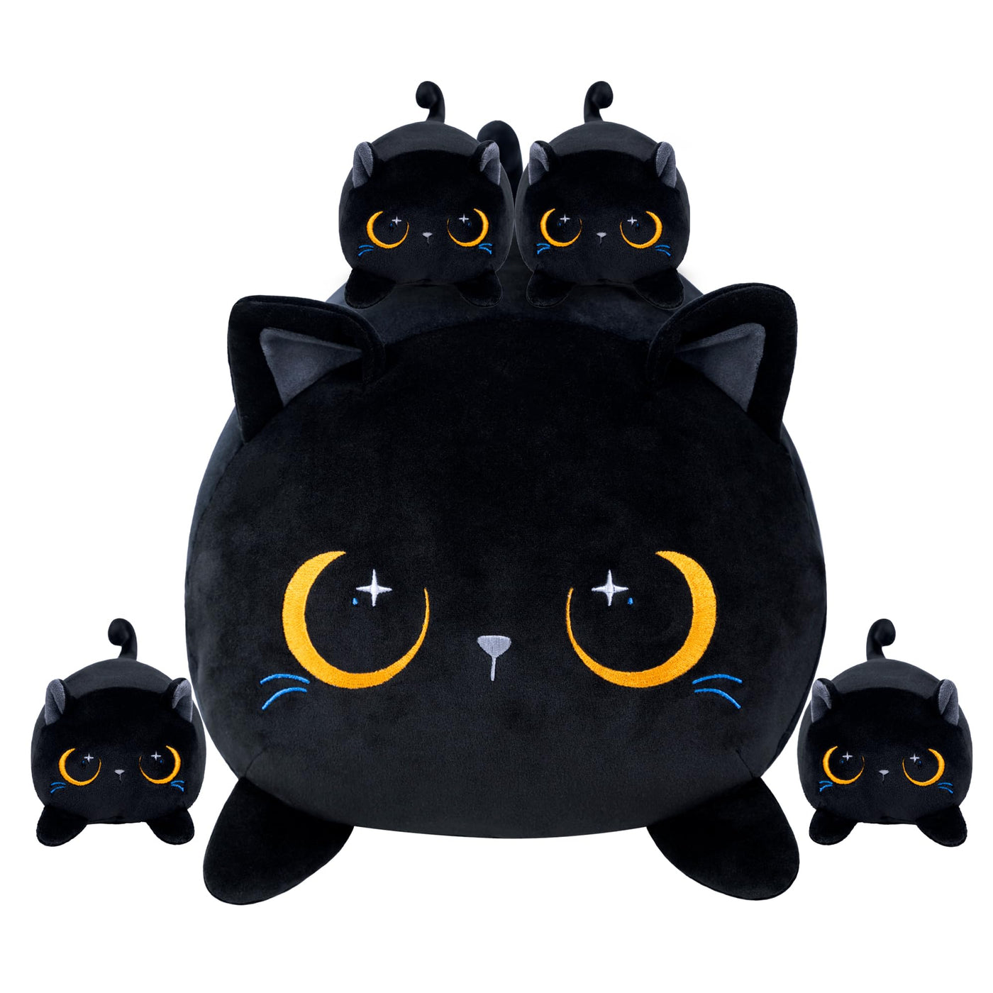Yiiquwen Black Cat Plush Cute Cat Stuffed Animal With 4 Baby Soft Pillow Christmas, Thanksgiving, Birthday Gift For Girls Boys K