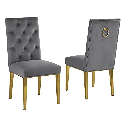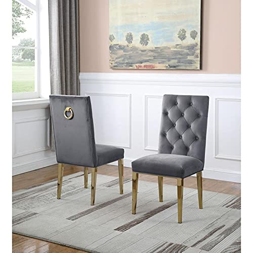 These Elegant Side Chairs Were Designed From The Ground Up To Add A Sophisticated, Contemporary Touch To Any Room In Your Home. This Set Of Two Chairs Feature A Stunning Stainless Steel Mirrored Legs, Ensuring Longevity, Strength And Beauty. The Tufted Back Provides Stable Support And Comfort. Available In Four Different Upholstery Color/Finish Options (Dark Gray Velvet (Sc74), Black Velvet (Sc75), Beige Velvet (Sc76), Or Teal Blue Velvet (Sc67), Allowing For An Array Of Customization In Any Living Space. Features: Includes Two (2) Side Chairs Contemporary / Glam Style Gold Stainless Steel Mirrored Frame And Legs Elegant Design Color: Dark Gray Velvet Upholstery Sturdy Build Construction Dimensions (Height X Length X Width) Inches: Side Chair: Overall: 40 Inches X 19 Inches X 20 Inches