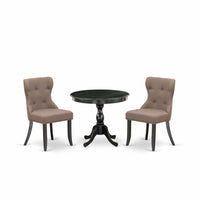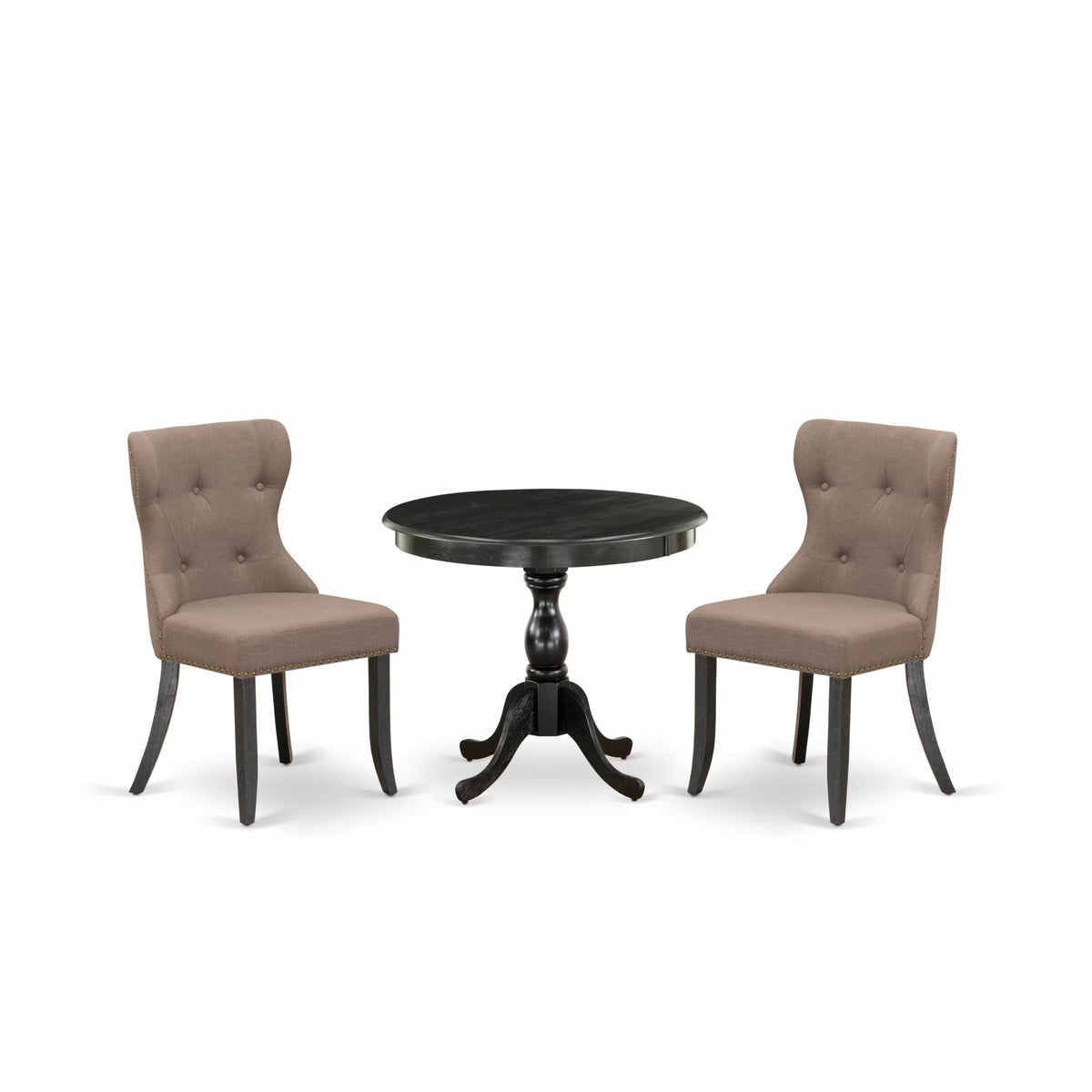 East West Furniture AMSI3-ABK-48 3 Piece Modern Dining Table Set Contains a Round Kitchen Table with Pedestal and 2 Coffee Linen Fabric Parsons Dining Chairs, 36x36 Inch, Wirebrushed Black