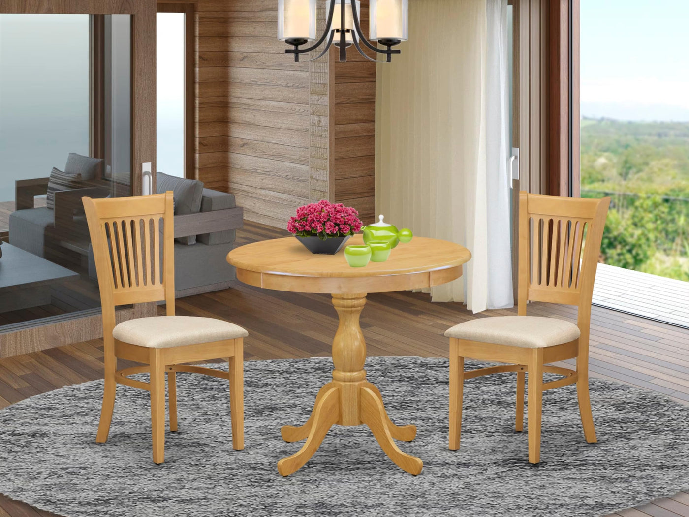 EAST WEST FURNITURE - AMVA3-OAK-C - 3-PC DINING TABLE SETThe 3 Piece kitchen set includes a dining table and 2 matching wooden chairs that bring a touch of sophistication to your dining room. The contemporary slatted back design of the chairs blends beautifully with the Linen Fabric seat, creating a sophisticated appearance that complements any decor seamlessly. The Dining Chair features a soft Linen Fabric Seat with spring support, a comfortable padded cushion, and a solid natural wood frame, offering both quality and design. The modern dining room table has a classic style and an Oak color that matches the wooden dining chairs, making them more attractive. The premium quality Rubber Wood material used to make the spacious tabletop ensures heightened sturdiness and long-lasting use. With easy and fast assembly in mind, each set comes with easy-to-follow instructions and all the necessary tools included. Cleaning the set is a breeze with a damp cloth and furniture cleanser due to the smooth brush finish. Enjoy the Elegant 3 Piece kitchen set with East West Furniture!PRODUCT FEATURES: Seat Material: Linen Fabric Color: Oak Chair Back Style: Slatted Back Dimension of Table: Length: 36; Width: 36; Height: 29.5. Chair Dimension: Length: 20; Width: 17; Height: 37.Include: 2 Dining Chairs and 1 Dinner Table.