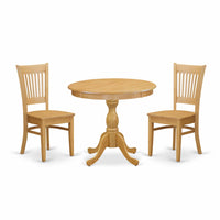 EAST WEST FURNITURE - AMVA3-OAK-W - 3-PC DINING TABLE SETThe 3-piece dining room table set is a sophisticated addition to your home, consisting of a wooden dining table and 2 matching wooden chairs. These chairs exude elegance and their modern design seamlessly blends with any decor. The wood chair's contemporary slatted back seamlessly blends with the wood seat, creating a sophisticated appeal. The classical style of the table is complemented by its Oak color, which matches the wood chair and enhances its attractiveness. The tabletop, made from high-quality Rubber Wood material, is spacious and durable, ensuring long-lasting use. Assembly is made easy with the set's inclusion of all necessary tools and easy-to-follow instructions. Cleaning this dining room table set is simple and can be done with a damp cloth and furniture cleaner due to the smooth brush finish. Experience the joy of dining with East West Furniture!PRODUCT FEATURES: Seat Material: Wooden Color: Oak Chair Back Style: Slatted Back Dimension of Table: Length: 36; Width: 36; Height: 29.5. Chair Dimension: Length: 20; Width: 17; Height: 37.Include: 2 Wood Dining Chair and A Modern Kitchen Table.