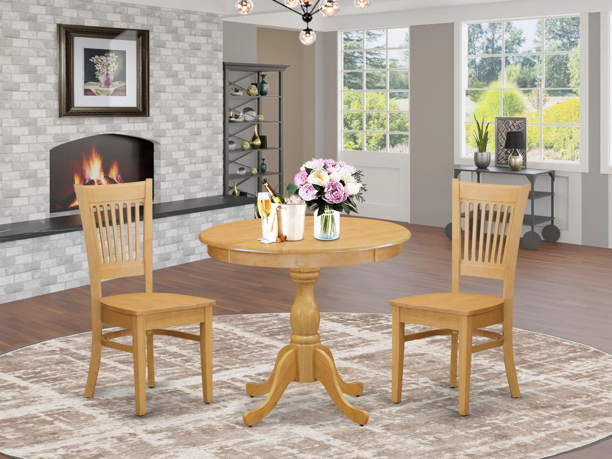 East West Furniture AMVA3-OAK-W 3 Piece Modern Dining Table Set Contains a Round Kitchen Table with Pedestal and 2 Dining Chairs, 36x36 Inch, Oak