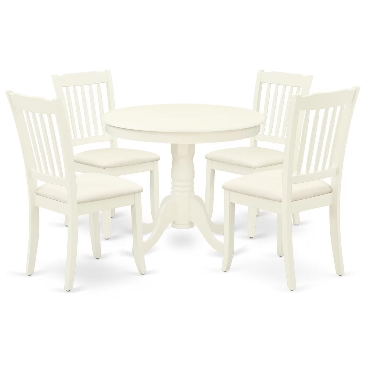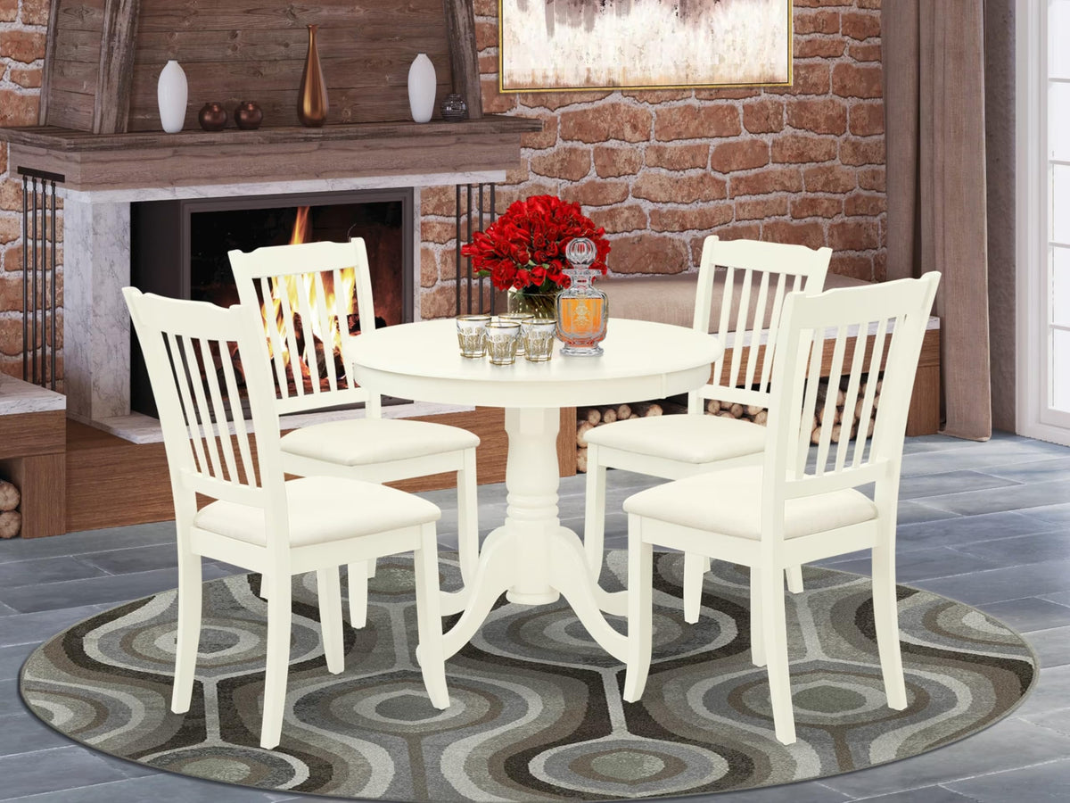 East West Furniture - Anda5-Lwh-C - Dining Room Setour Dining Room Set Exudes Timeless Charm And Enhances The Beauty Of Your Space, Look No Further Than This Transitional-Style Wooden Dining Table Set. With Its Gracefully Curved Details, This Set Combines A Traditional Design With A Contemporary Twist And Consists Of Five Individual Pieces. The Round Linen White Table Coupled With Its Pedestal Legs Imparts A Unique And Distinguished Aesthetic To The Overall Design. The Chairs And Round Wooden Table Are Expertly Crafted From High-Quality Asian Wood (Rubber Wood), Ensuring Exceptional Durability And Stability. The Table Boasts A Sturdy Hardwood Structure, While The Chairs Feature Comfortable Linen Fabric Seats And Slatted Backs, Providing Excellent Support For Your Back. Additionally, This Set Is Effortless To Carry, Clean, Assemble, And Adjust, Owing To Its Optimal Size. The Classic Design Of This Breakfast Table Perfectly Complements Any Home Decor, While The Comfortable Linen Fabric Seats And Slatted Backs Of The Chairs Ensure That Guests Are At Ease While Dining.Product Features: Frame Material: Rubber Wood Seat: Linen Fabric Frame Color: Linen White Chairs Dimensions: Length: 22; Width: 18; Height: 38. Table Dimensions: Length: 36; Width: 36; Height: 29.5.Includes: 4 Dining Room Chairs And 1 Round Wooden Table
