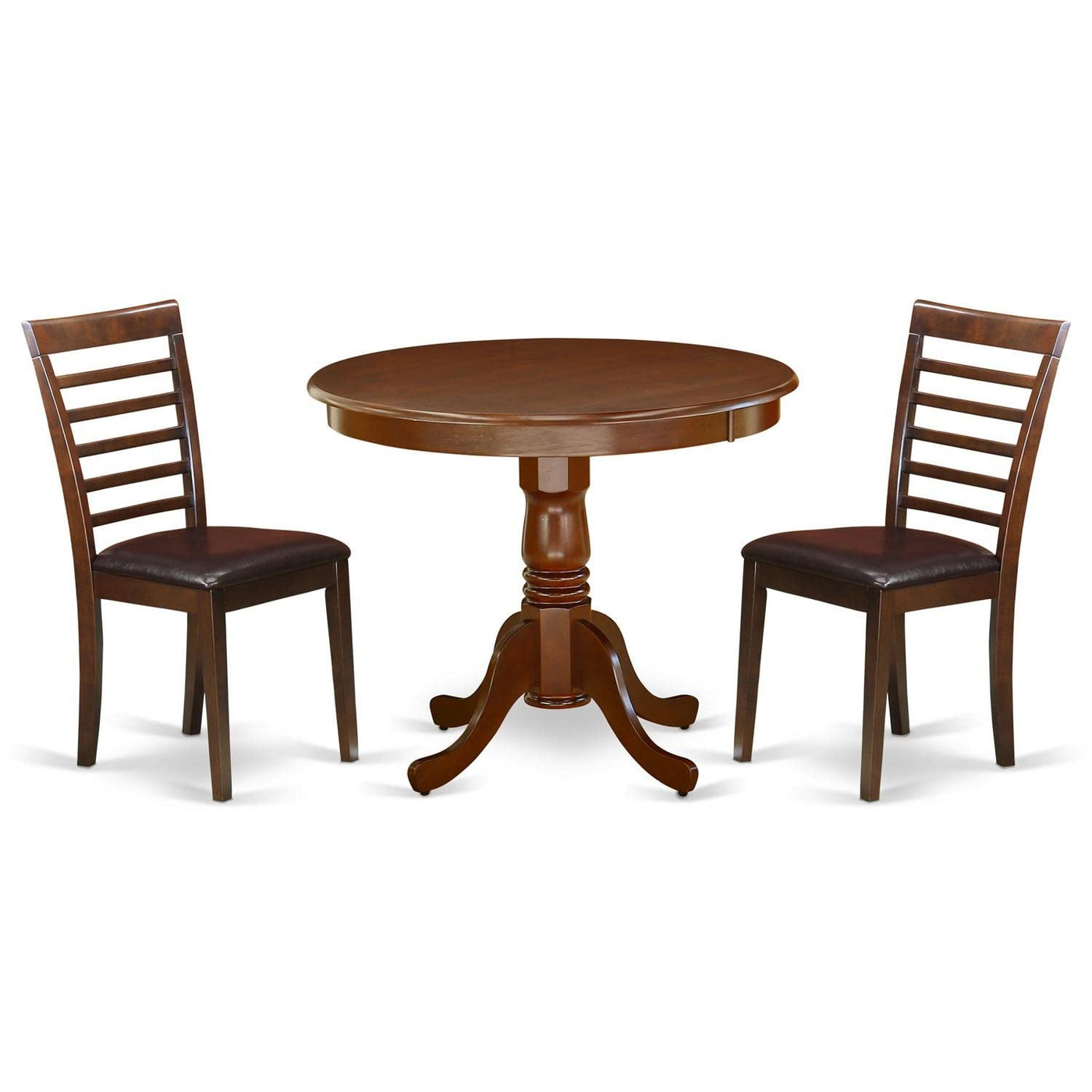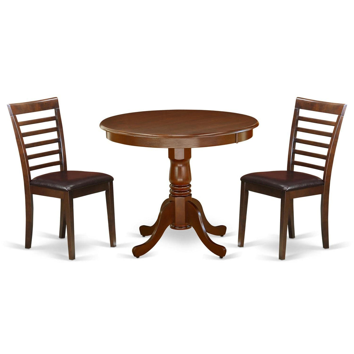 East West Furniture - -Anml3-Mah-Lc- 3 Piece Of Dining Table Setif You'Re Looking For A Charming Addition To Your Living Area That Will Enhance Its Beauty, Consider This Transitional Design-Inspired Dining Set. This 3-Piece Wooden Dining Set Has A Traditional Style With A Modern Twist That Highlights Its Curves And Details. It Features A High-Quality Asian Wood (Rubber Wood) Structure That Provides Sturdiness And Stability To The Chairs And Mid-Century Dining Table. The Chairs Have Ladder-Backs And Comfortable Faux Leather Seats, While The Table Is Sturdy And Reliable. This Mid-Century Dining Table Set Is Easy To Carry, Clean, Assemble, And Move Around Due To Its Excellent Measurements. Its Classic Style Fits Well With Any Home Decor, And The Smooth Faux Leather Seats And Ladder-Back Chairs Provide Comfortable Support For Users.Product Features: Seat: Faux Leather Round Kitchen Table Color: Mahogany Kitchen Chairs Color: Mahogany Wooden Dining Chairs Specifications: Length: 22; Width: 17; Height: 38. Round Dining Table Dimensions: Length: 36; Width: 36; Height: 29.5.Includes: 2 Wooden Dining Chairs And 1 Wood Kitchen Table