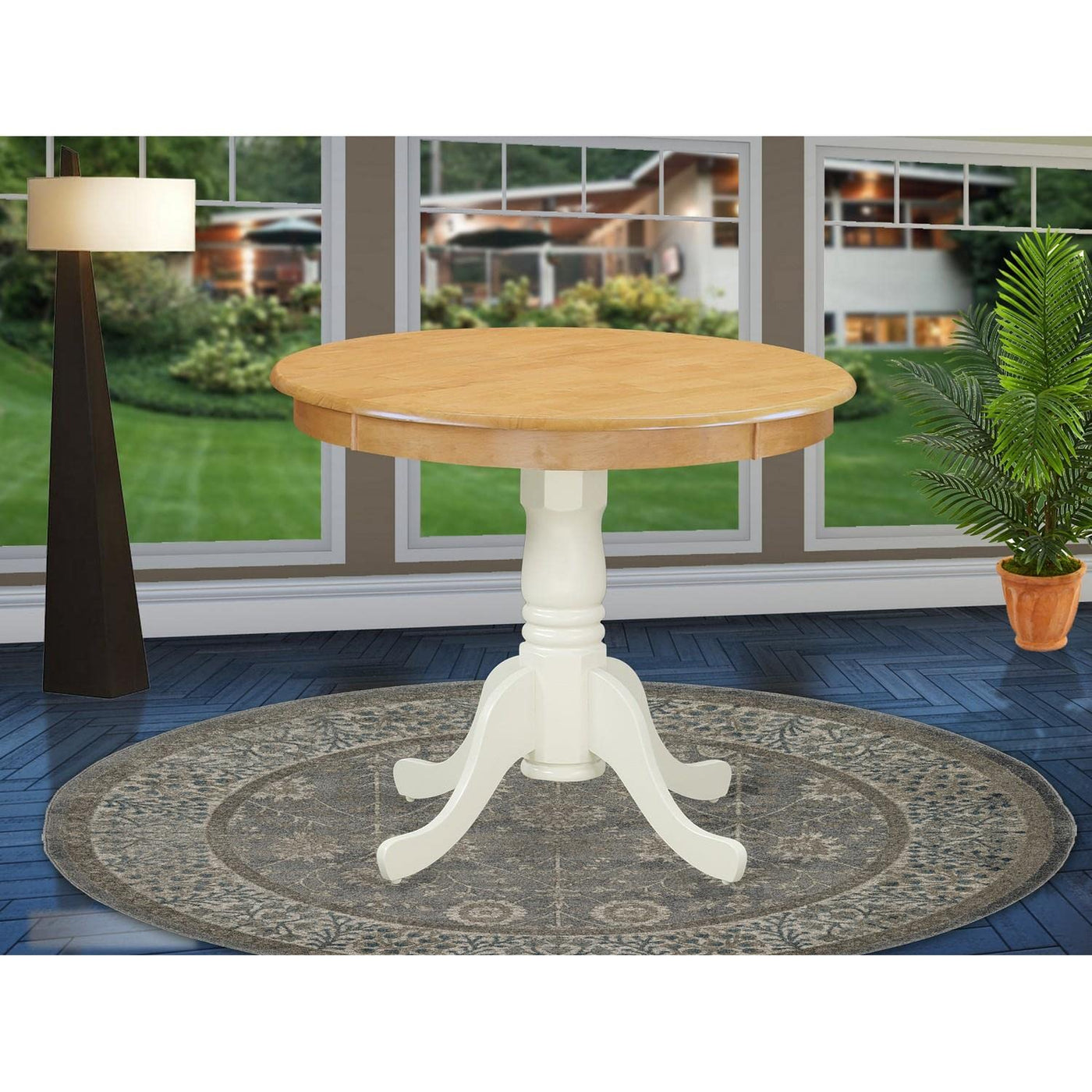East West Furniture - Ant-Olw-Tp - Antique Pedestal Dining Tableelevate The Visual Appeal Of Your Dining Room With Our Charmingly Contemporary Dining Table. Crafted From Premium-Grade Line White Asian Solid Wood (Rubber Wood), The Body Of This Innovative Dining Table Boasts Exceptional Strength And Stability. The Top Surface Of This Mid-Century Dining Table Features High-Quality Oak Color Wood, Lending It A Stunning Appearance. The Cutting-Edge Design Of This Dining Table Lends An Air Of Sophistication To Any Dining Room. With A Heavy-Duty Solid Wood Structure And A Modern Round Pedestal Design, This Dining Table Offers Remarkable Stability And Contemporary Elegance. Thanks To Its Ideal Size, This Modern Dining Table Is Easy To Move, Clean, Assemble, And Reposition, Making It A Great Fit For Any Room Decor. This Pedestal Round Kitchen Table Is Friendly, Long-Lasting, And An Excellent Choice For Enjoying A Memorable Dining Experience With Family And Friends.Product Features: Table Design: Round Pedestal Style Table Top Color: Oak Pedestal Legs Color: Linen White Round Dining Table Dimensions: Length: 36; Width: 36; Height: 29.5.
