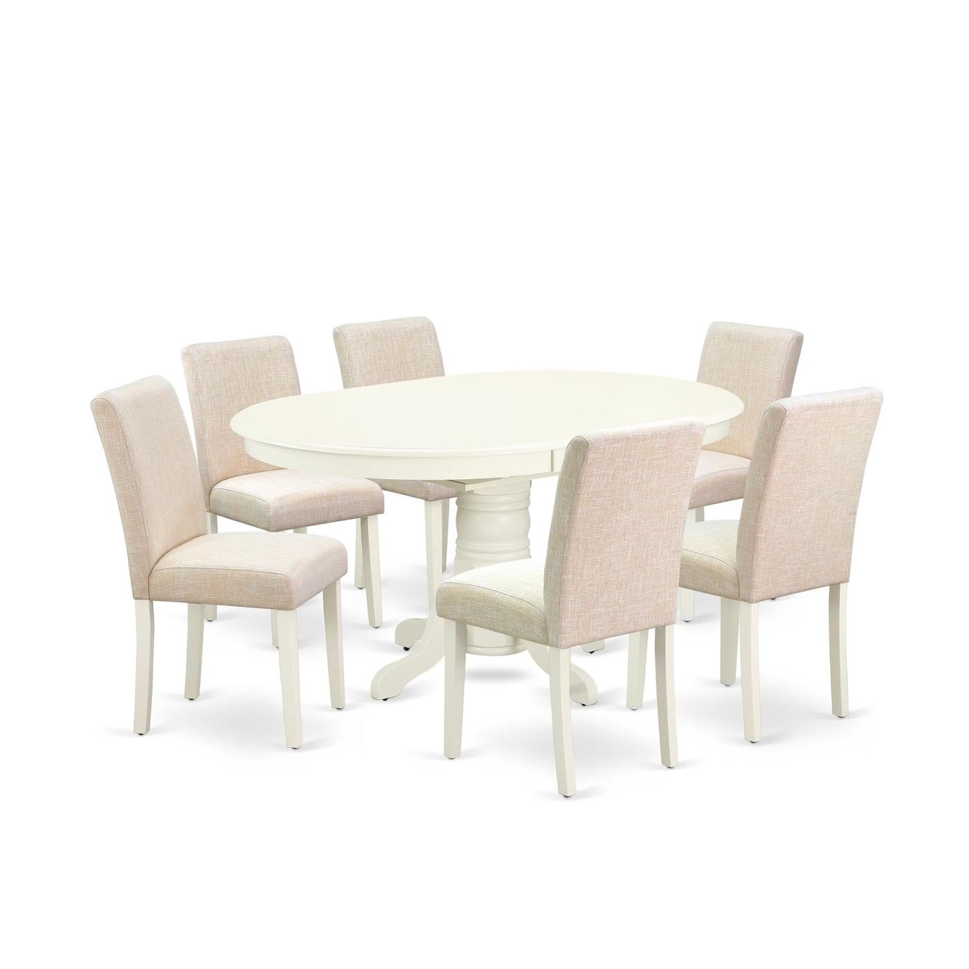 East West Furniture Avab7-Lwh-02 7 Piece Dining Table Set Consist Of An Oval Kitchen Table With Butterfly Leaf And 6 Light Beige Linen Fabric Parson Dining Chairs, 42X60 Inch, Linen White