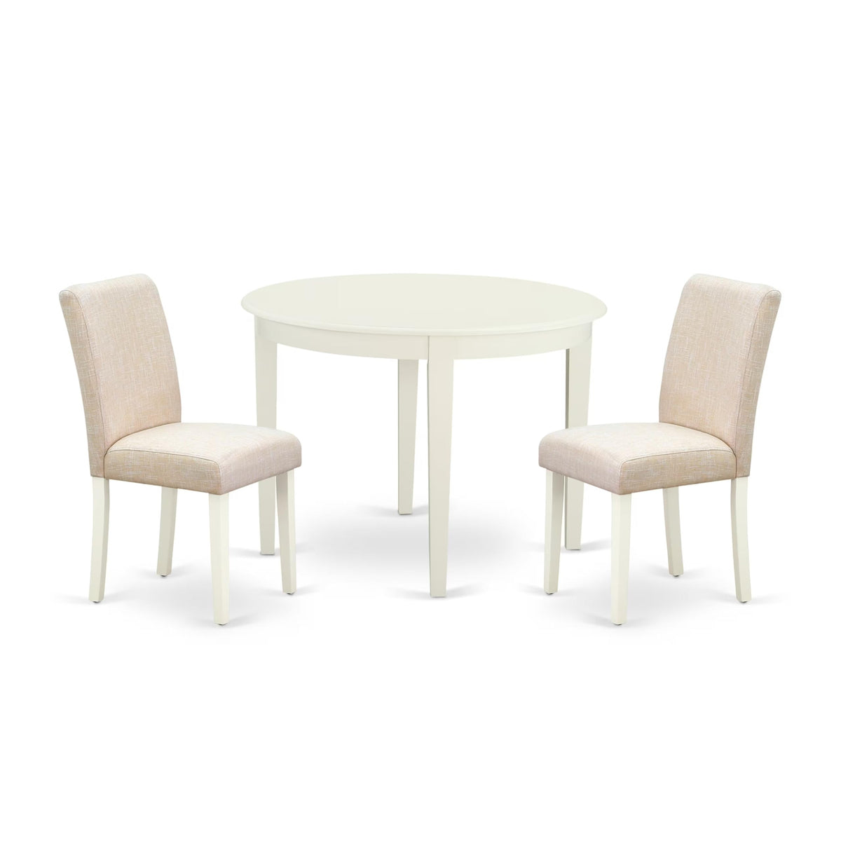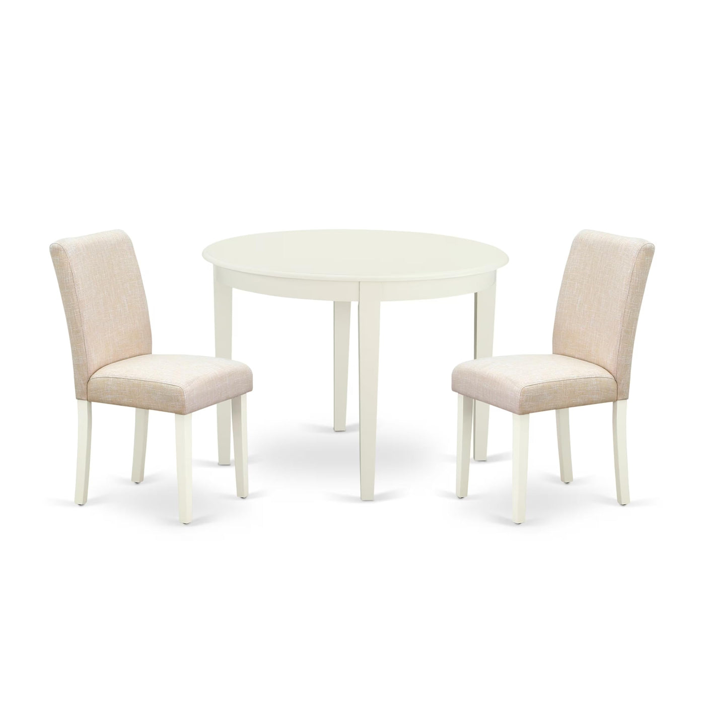 East West Furniture Boab3-Lwh-02 3 Piece Kitchen Table Set For Small Spaces Contains A Round Dining Room Table And 2 Light Beige Linen Fabric Upholstered Chairs, 42X42 Inch, Linen White