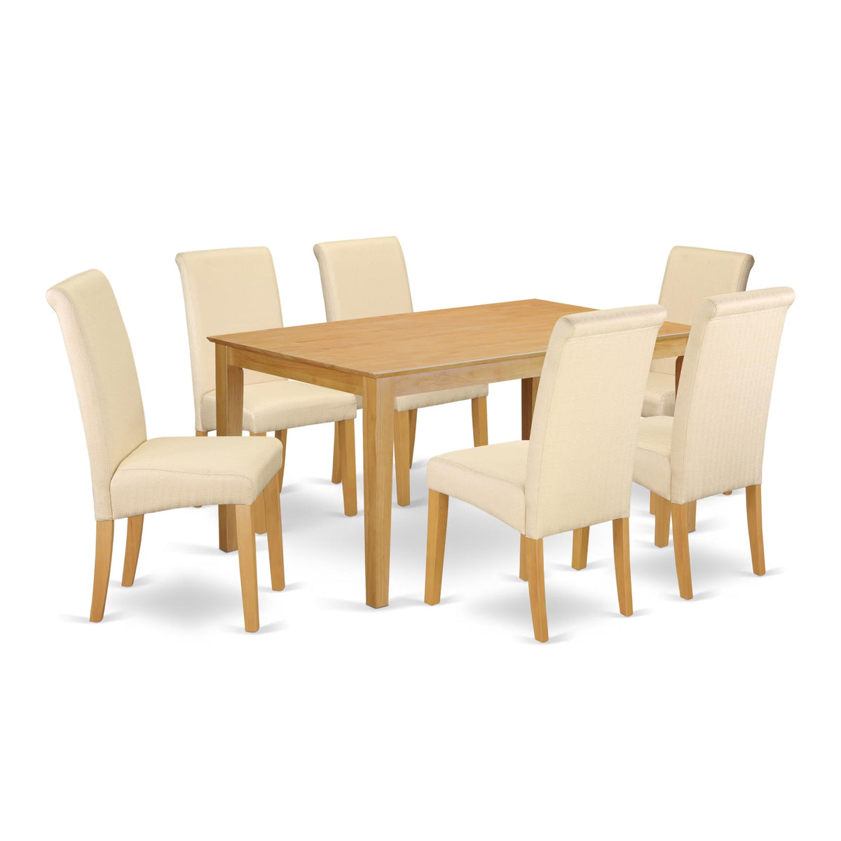 East West Furniture - Caba7-Oak-02 - 7-Piece Dining Table Setelevate The Ambiance Of Your Dining Room With This Exquisite Mid-Century 7-Piece Dining Set, Comprising A Stylish Modern Dining Table With 4 Legs And 6 Tastefully Upholstered Dining Chairs. The Classic Design Of This Kitchen Set Serves To Enhance The Aesthetic Appeal Of Your Dining Room. Our Dining Chairs, Made From Premium Quality Linen Fabric, Provide Optimal Comfort And An Exceptional Seating Experience. The Oak Hardwood Kitchen Table And Beige Linen Fabric Parsons Dining Chairs, Featuring High Rollbacks, Exude A Timeless Elegance That Elevates The Sophistication Of Your Dining Space. Built From The Finest Asian Wood (Rubberwood), This Wooden Dining Table Set Delivers Unparalleled Durability. Our Skilled Craftsmen Have Fashioned This Dining Set, Ensuring A Seamless And Polished Finish. Assembling These Padded Parson Chairs And Modern Dining Table Is Effortless, With Instructions Included In The Package. Keeping This Small Dining Table Set Clean Is A Breeze, Requiring Only A Mild Furniture Cleaner To Maintain Its Pristine Appearance.Product Features: Fabric: Linen Fabric Fabric Color: Beige Wood Color: Oak Wood Table Dimension: Length: 60; Width: 36; Height: 30. Kitchen Chairs Measurement: Length: 22.5; Width: 18; Height: 38.5.Package Include: 6 Kitchen Parson Chairs And A Dining Table.