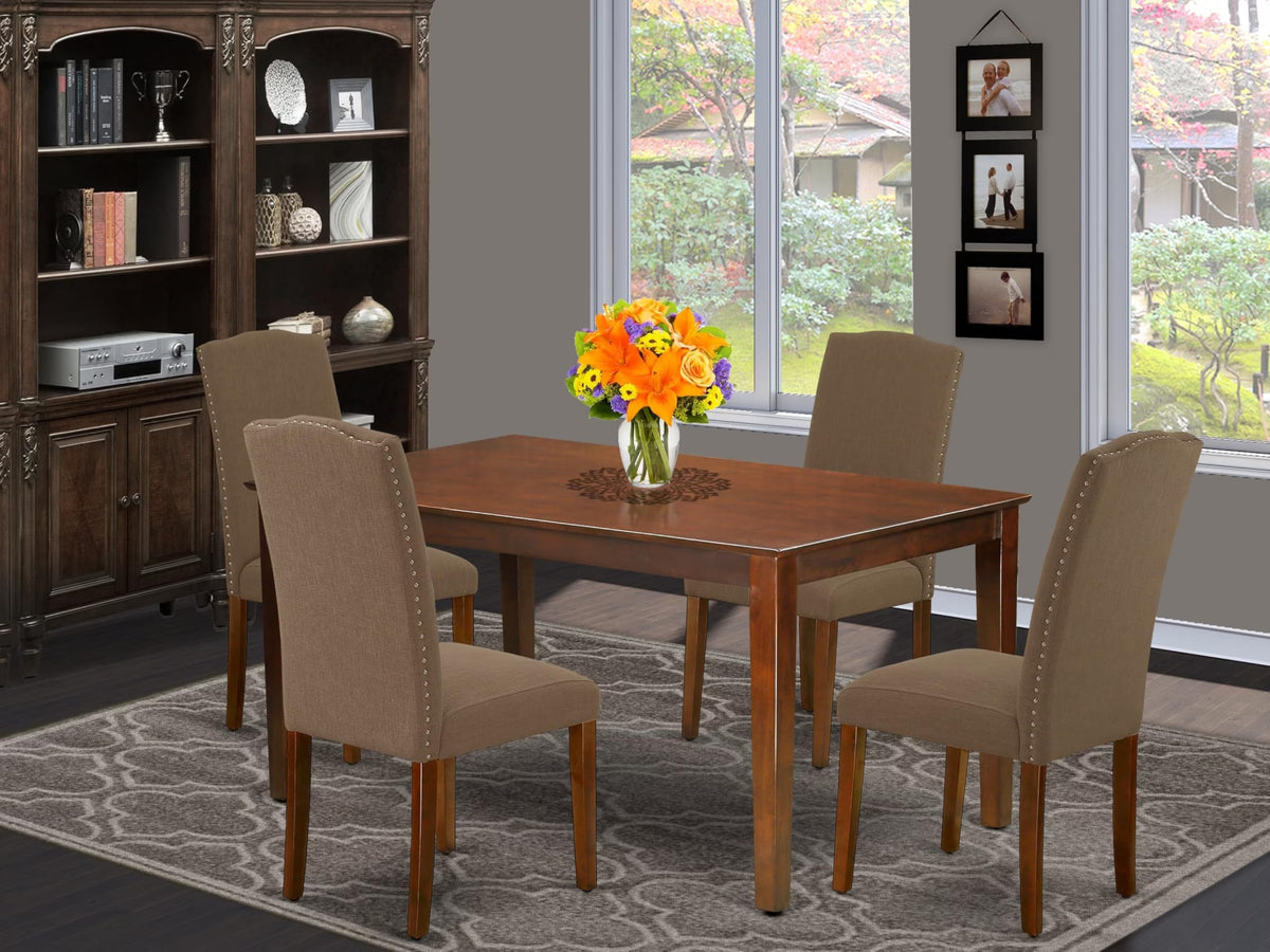 East West Furniture - Caen5-Mah-18 - 5-Piece Dining Table Setthis Wonderful 5-Piece Modern Kitchen Set Is Perfect For Your Attractive Dining Room. It Includes 4 Wonderful Dining Chairs And A Stunning Four-Legged Dining Table. The Timeless Style Of This Small Dining Table Set Will Increase The Charm Of Your Dining Area. The Parsons Dining Chairs Are Made Of High-Quality Linen Fabric, Delivering Complete Comfort And A Great Sitting Experience. The Kitchen Set Features A Mahogany Solid Wood Rectangular Table And Structure And A Gorgeous Dark Coffee Linen Fabric Parsons Dining Chairs Seat And High Back, Adding Beauty To Your Dining Room. This Rectangular Kitchen Set Provides Excellent Durability As It Is Created With Asian Wood, Also Known As Rubberwood. Highly Experienced Carpenters Have Crafted The Padded Parson Chairs And Rectangular Table, Delivering A Smooth And High-End Finish. Assembling These Classy Padded Parson Chairs And Small Dining Table Is Easy With The Instructions Included In The Package. The Wood Dining Table Set Is Easy To Clean With Any Furniture Cleaner, Taking Only A Little Time. It Is Quite Simple To Clean And Usually Provides A Fresh Look.Product Features: Fabric: Linen Fabric Fabric Color: Dark Coffee Wood Color: Mahogany Dining Table Dimension: Length: 60; Width: 36; Height: 30. Dining Chairs Dimension: Length: 24.5; Width: 19; Height: 40.5.Package Include: 4 Dining Room Chairs And A Kitchen Table.