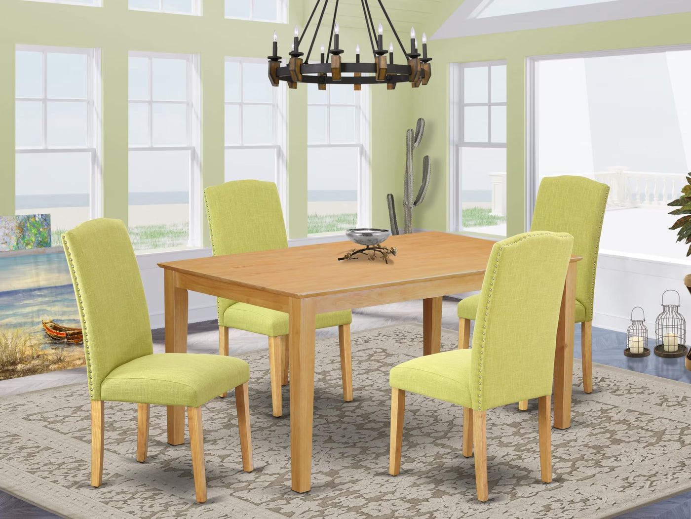 East West Furniture - Caen5-Oak-07 - 5-Piece Dining Table Setthis Gorgeous 5-Piece Wood Dining Table Set Is Perfect For Your Amazing Dining Area. It Includes 4 Gorgeous Kitchen Chairs And A Wonderful Four-Legged Modern Dining Table. The Timeless Style Of This Kitchen Set Will Boost The Elegance Of Your Dining Room. The Padded Parson Chairs Are Made Of Prime Quality Linen Fabric, Providing Complete Comfort And An Amazing Sitting Experience. The Small Dining Table Set Features An Oak Hardwood Modern Dining Table And Frame And A Stunning Limelight Linen Fabric Kitchen Dining Chairs Seat And High Back, Giving Magnificence To Your Dining Room. This Mid-Century Dining Table Set Provides Excellent Durability As It Is Built With Asian Wood, Also Known As Rubber Wood. Highly Experienced Carpenters Have Built The Parsons Dining Room Chairs And Rectangular Table, Giving A Smooth And High-End Finish. Assembling These Elegant Dining Room Chairs And Small Table Is Easy With The Guidance Included In The Package. The Small Kitchen Set Is Easy To Clean With Any Furniture Cleaner, Taking Only A Little Time. It Is Effortless To Clean And Always Delivers A Fresh Look.Product Features: Fabric: Linen Fabric Fabric Color: Limelight Wood Color: Oak Dining Room Table Dimension: Length: 60; Width: 36; Height: 30. Dining Chairs Specifications: Length: 24.5; Width: 19; Height: 40.5.Package Include: 4 Kitchen Chairs And A Dining Table.