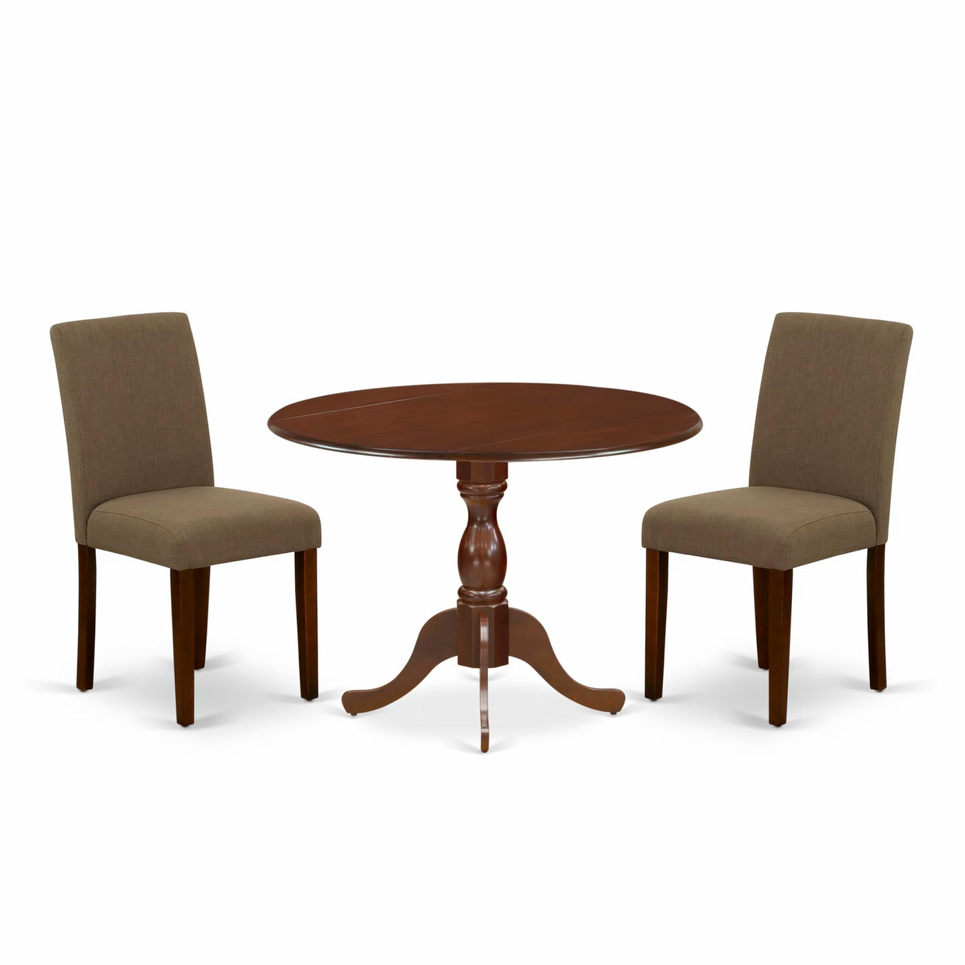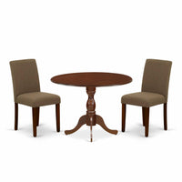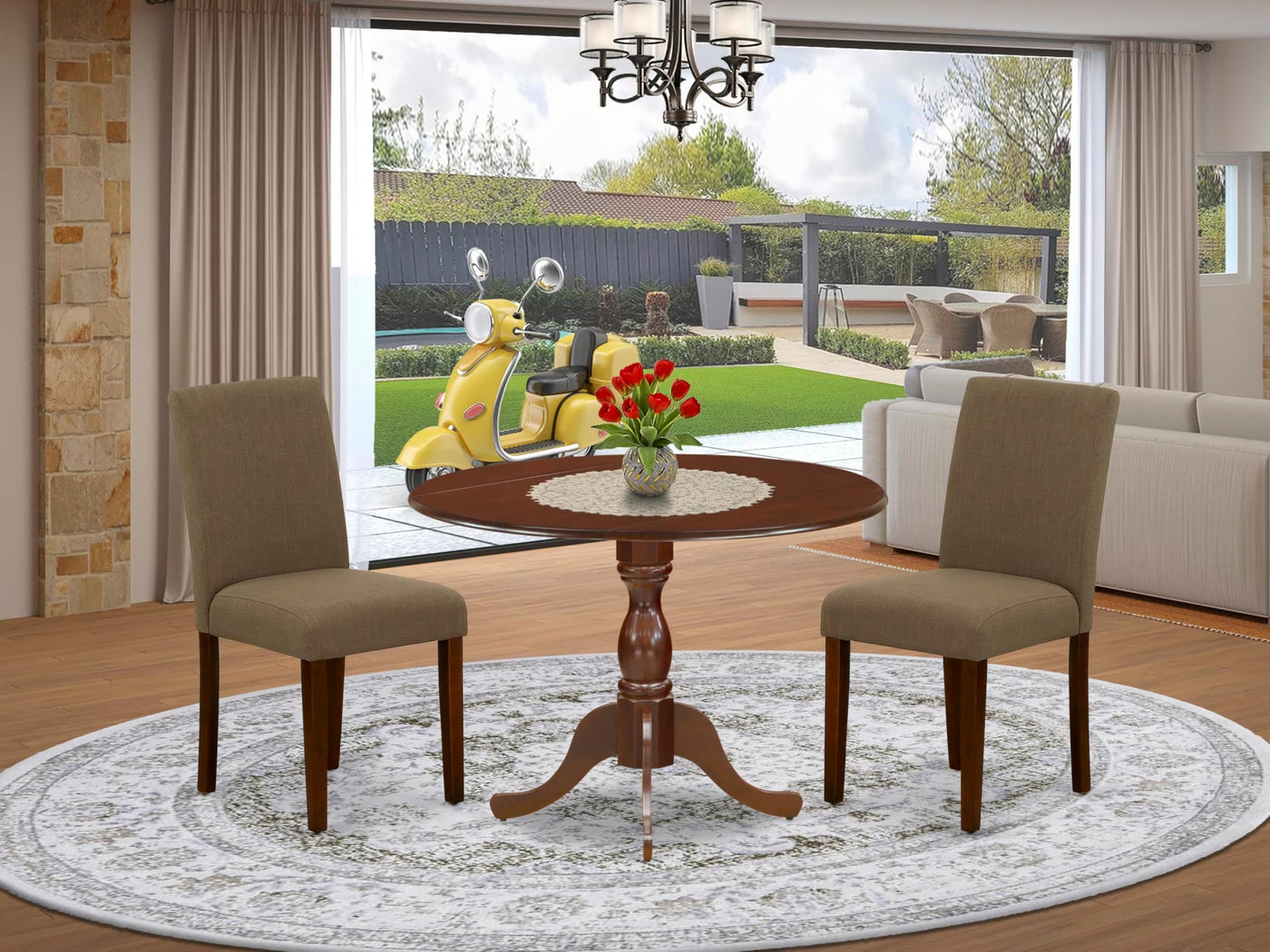 East West Furniture DMAB3-MAH-18 3 Piece Dining Room Table Set Contains a Round Dining Table with Dropleaf and 2 Coffee Linen Fabric Upholstered Parson Chairs, 42x42 Inch, Mahogany