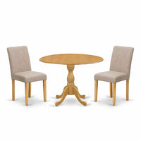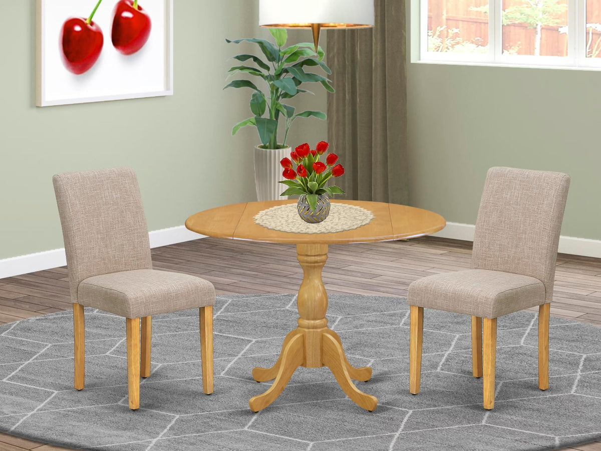 East West Furniture DMAB3-OAK-04 3 Piece Kitchen Table Set Contains a Round Dining Room Table with Dropleaf and 2 Light Tan Linen Fabric Parsons Dining Chairs, 42x42 Inch, Oak