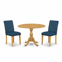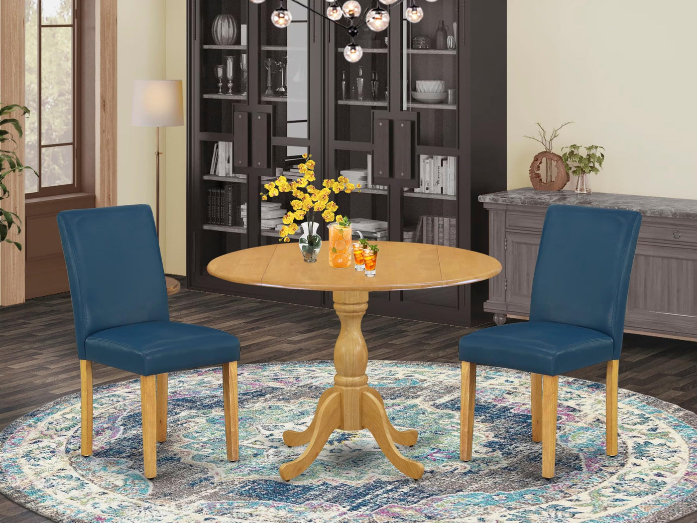 East West Furniture DMAB3-OAK-55 3 Piece Dining Table Set Contains a Round Dining Room Table with Dropleaf and 2 Oasis Blue Faux Leather Parsons Chairs, 42x42 Inch, Oak