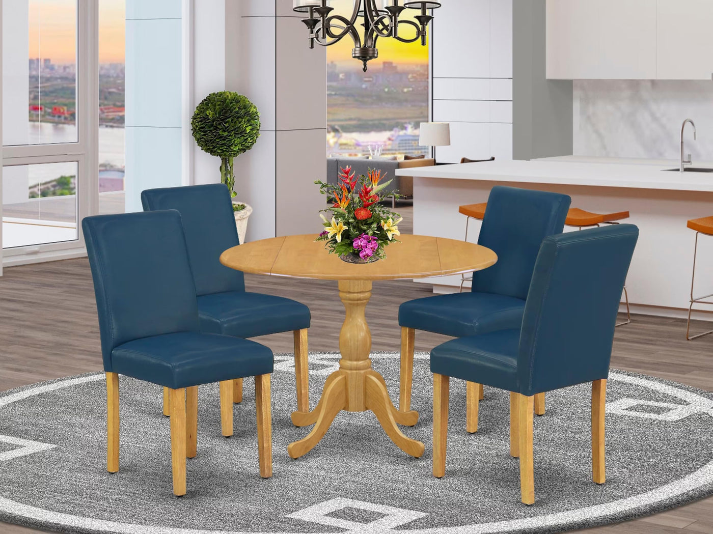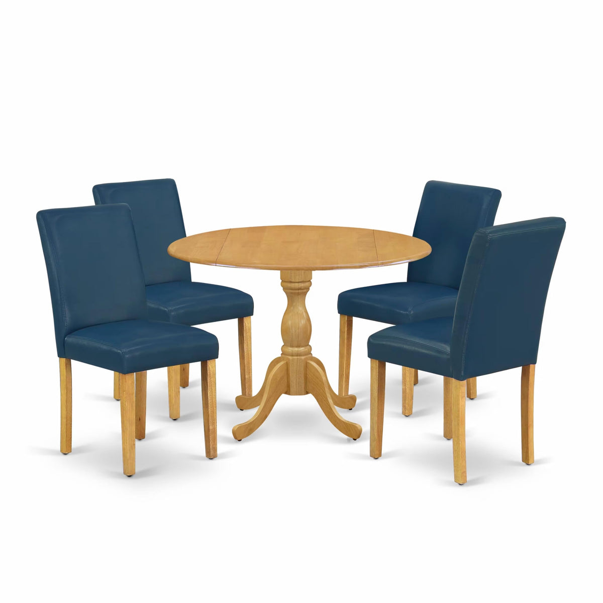 East West Furniture DMAB5-OAK-55 5 Piece Dining Set Includes a Round Dining Room Table with Dropleaf and 4 Oasis Blue Faux Leather Upholstered Parson Chairs, 42x42 Inch, Oak
