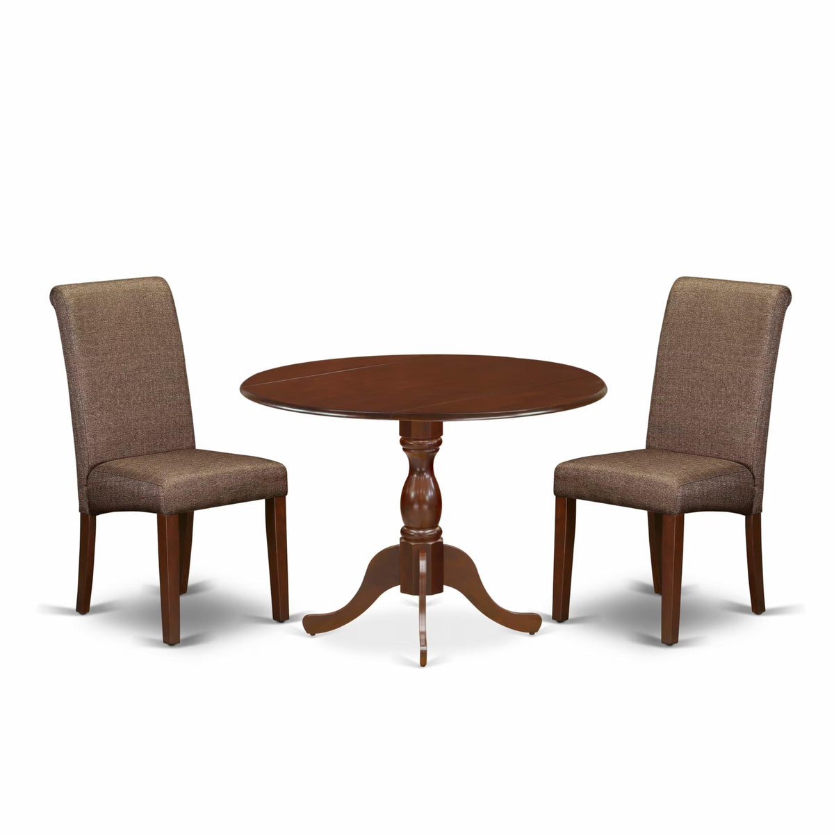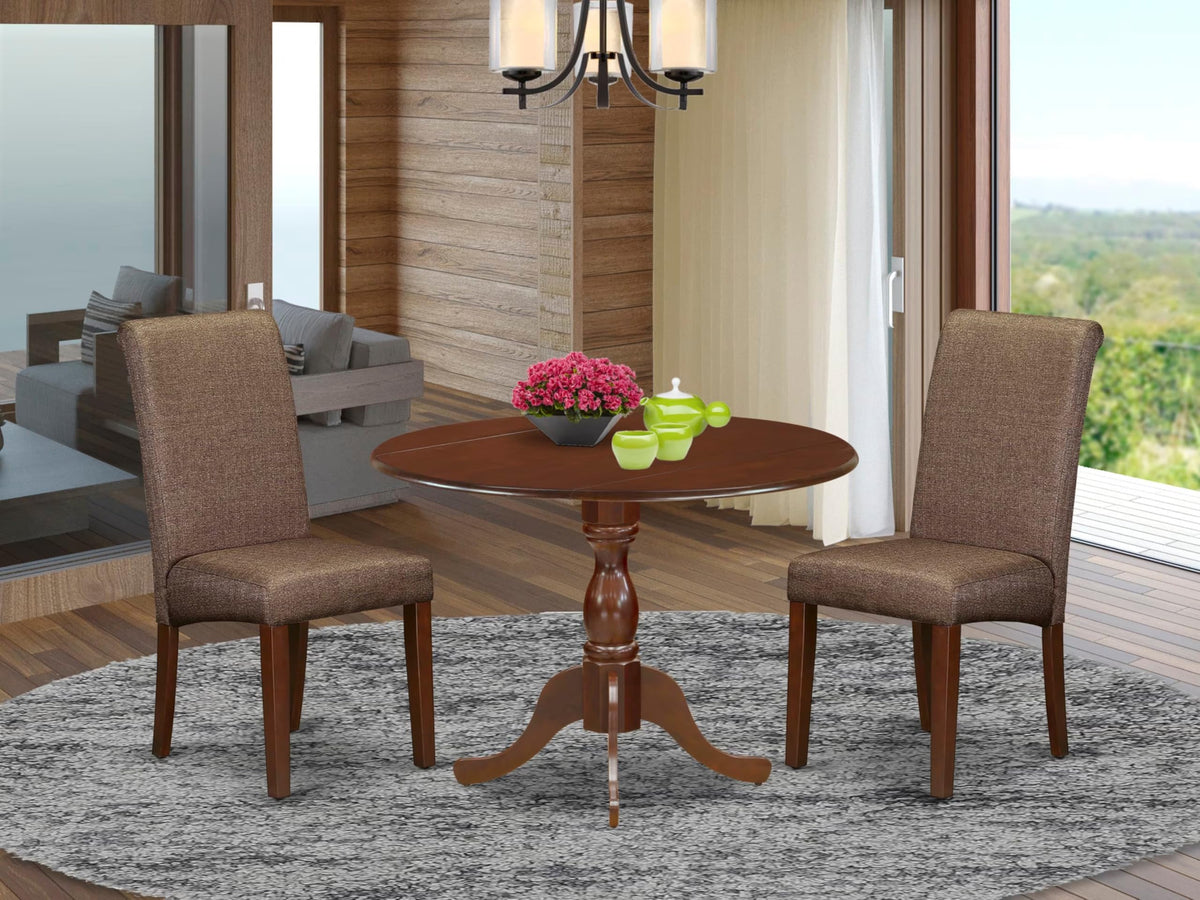 East West Furniture DMBA3-MAH-18 3 Piece Dining Table Set Contains a Round Dining Room Table with Dropleaf and 2 Brown Linen Linen Fabric Upholstered Chairs, 42x42 Inch, Mahogany