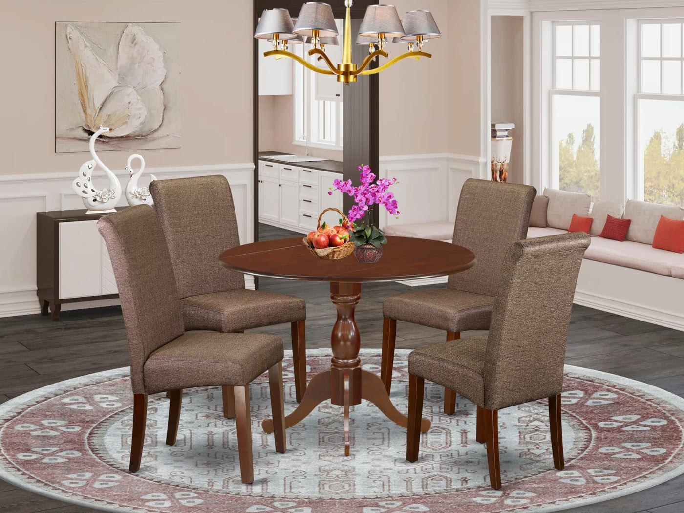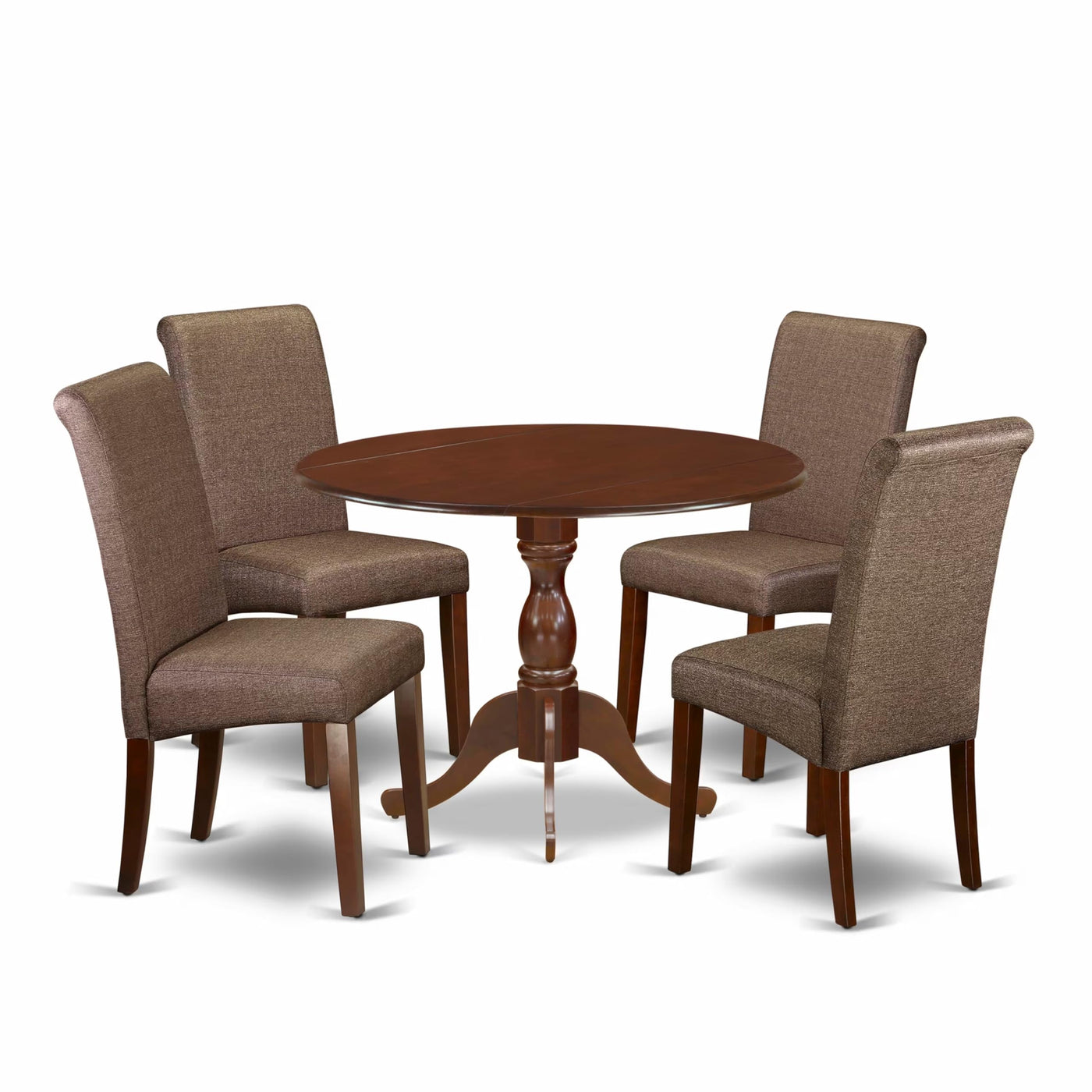 EAST WEST FURNITURE - DMBA5-MAH-18 - 5-PC DINING TABLE SETThe Elegant 5-Piece Wood Dining Table Set is a sophisticated and stylish addition to any dining room. This set features a modern Drop Leaves dining room table and 4 matching mid-century dining chairs that seamlessly complement any decor. The innovative design of the chairs adds an element of elegance to the room, while the contemporary High Chair Back blends beautifully with the Linen Fabric seat, creating a sophisticated appearance. Each chair boasts soft Linen Fabric upholstery with spring support, a comfortable padded cushion, and a solid natural wood frame that exudes both quality and design. The modern kitchen table is designed in a classical style, and its Mahogany color matches perfectly with the Linen Fabric dining chairs, creating an attractive overall appearance. The Spacious tabletop, made from top-quality Rubber Wood material, ensures heightened durability and long-lasting use. The set is designed with easy and fast assembly in mind, and each package comes with comprehensive instructions and all necessary tools, making the assembly process simple and straightforward.KITCHEN TABLE SET FEATURES: Fabric Type: Linen Fabric Linen Fabric Color: Brown Color: Mahogany Chair Back Style: High Back Dimension of Table: Length: 42; Width: 42; Height: 29.5. Chair Dimension: Length: 22.5; Width: 18; Height: 38.5.Include in the Package: 4 Kitchen Chairs and A Round Table.