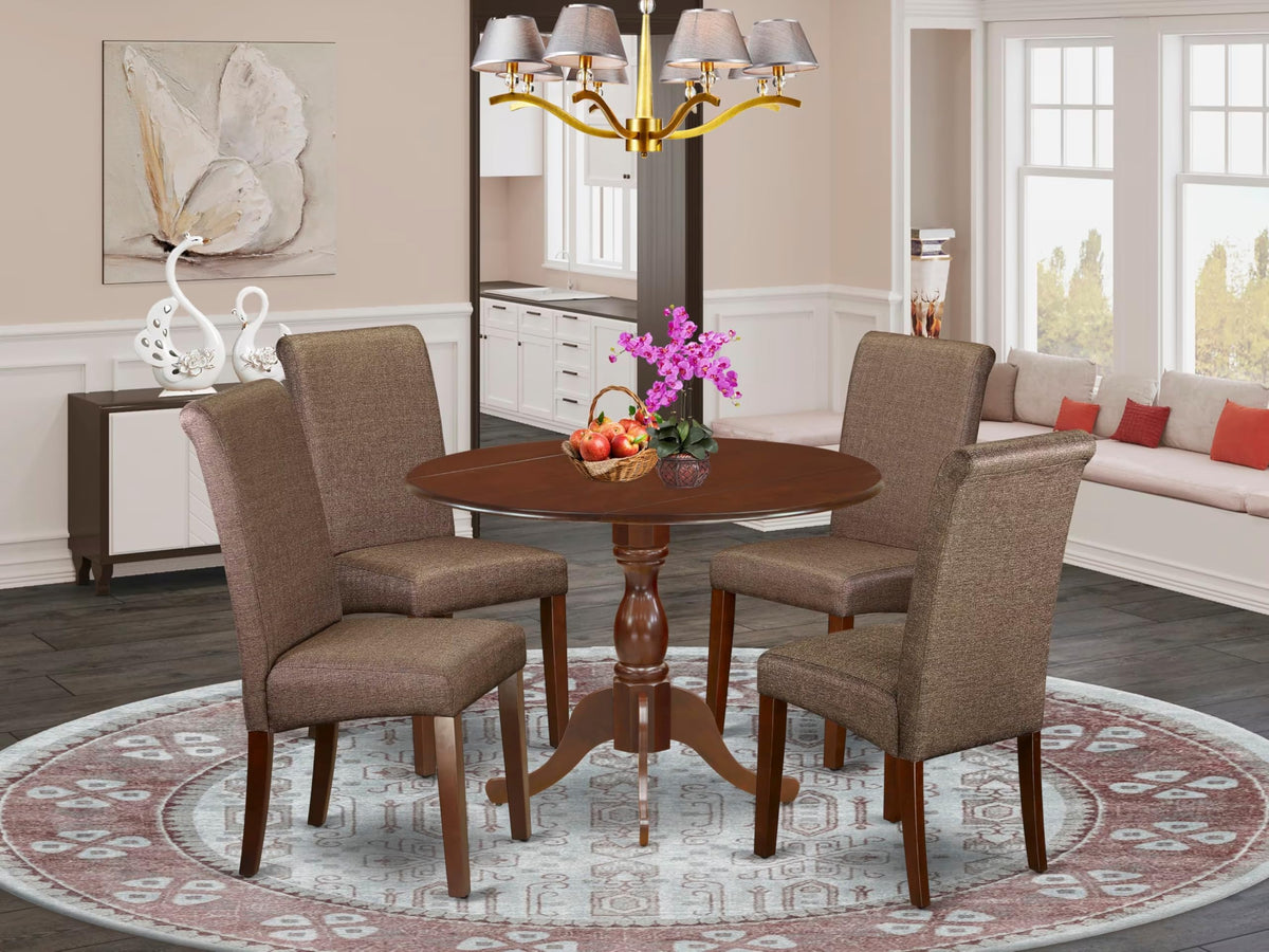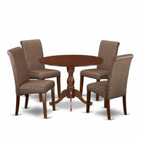 East West Furniture DMBA5-MAH-18 5 Piece Dining Room Furniture Set Includes a Round Dining Table with Dropleaf and 4 Brown Linen Linen Fabric Upholstered Chairs, 42x42 Inch, Mahogany