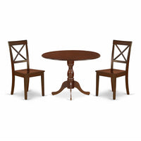 EAST WEST FURNITURE - DMBO3-MAH-W - 3-PC WOODEN DINING TABLE SETThe sophisticated 3-piece kitchen table set comprises a drop leaves dining table and 2 matching wooden chairs that exude elegance. The modern design of the chairs seamlessly complements any decor, while their solid wood seat and contemporary X-Back design add a touch of sophistication to the room. The classic style of the pedestal table, coupled with the mahogany color that matches the dining chairs, enhances its overall appeal. The spacious tabletop is crafted from high-quality rubberwood material that ensures heightened durability and long-lasting use. The set is designed with ease of assembly in mind, and it comes conveniently packed with all necessary tools and easy-to-follow instructions. The dining room set features a smooth brush finish that makes it easy to clean with a damp cloth and furniture cleanser. In conclusion, the East West Furniture dining room set is a perfect blend of sophistication, elegance, and functionality that will add charm to any dining space.DINING ROOM TABLE SET FEATURES: Seat Material: Wooden Color: Mahogany Chair Back Style: X-Back Dimension of Table: Length: 42; Width: 42; Height: 29.5. Chair Dimension: Length: 21; Width: 18; Height: 38.Include in the Package: 2 Kitchen Chairs and A Dining Table.