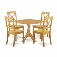 EAST WEST FURNITURE - DMBO5-OAK-W - 5-PC TABLE SETThis 5-piece dining set comprises a dropleaf round table and 4 chairs, providing ample space to accommodate your family. The set boasts a sophisticated and eye-catching appearance with a traditional design, featuring Oak kitchen and dining chairs that blend seamlessly with any kitchen decor. Elevate your home's aesthetics with our rustic-style kitchen set, complete with an Oak finish that adds a unique charm to your dining room. The solid wood legs of the chairs and table exude a sense of durability and classic appeal, while the contemporary design adds an element of attractiveness to your kitchen. The X-back and cone-shaped legs of the chairs provide a comfortable and relaxing dining experience. The smooth surface of the table and chairs makes them easy to clean, ensuring hassle-free maintenance. Assembly is a breeze and can be completed quickly with step-by-step instructions.PRODUCT FEATURES: Wood Type: Asian Wood Color: Oak Chairs Back Style: X-Back Chairs Dimension: LLength: 21; Width: 18; Height: 38. Dimension of Table: Length: 42; Width: 42; Height: 29.5.Include in The Package: A Dining Table with 4 Dining Room Chairs.