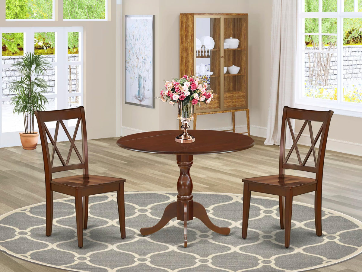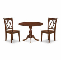 EAST WEST FURNITURE - DMCL3-MAH-W - 3-PC WOODEN DINING TABLE SETThe 3 Piece mid-century dining set is a sophisticated addition to any home, consisting of a Drop Leaves dining table and 2 wooden chairs that perfectly match in design and style. The modern and elegant design seamlessly complements any décor, adding a touch of sophistication to the room. The mid-century chair features a contemporary Double X-Back that seamlessly blends with the wooden seat, creating a refined and sophisticated appeal. The classical style round pedestal dining table is designed with a Mahogany color that matches the dining room chair, adding to its overall attractiveness. The spacious tabletop is crafted from premium quality Rubber Wood material, ensuring durability and long-lasting use. The dining set is designed with ease of assembly in mind, and each set comes conveniently packed with clear and concise instructions and all necessary tools included. The smooth brush finish on the dining table set allows for easy cleaning with a damp cloth and furniture cleanser, maintaining the set's stunning appearance over time. Enjoy the stylish and functional East West Furniture dining set in your home, and experience the high level of quality and craftsmanship it offers.PRODUCT FEATURES: Seat Material: Wooden Color: Mahogany Chair Back Style: Double X-Back Dimension of Table: Length: 42; Width: 42; Height: 29.5. Chair Dimension: Length: 22; Width: 18; Height: 37.Include in the Package: 2 Kitchen Chairs and 1 Modern Kitchen Table.