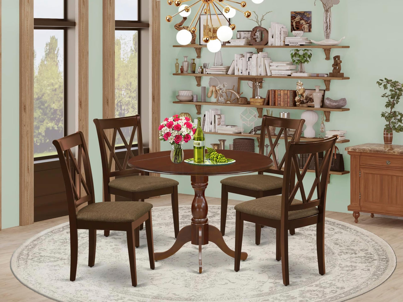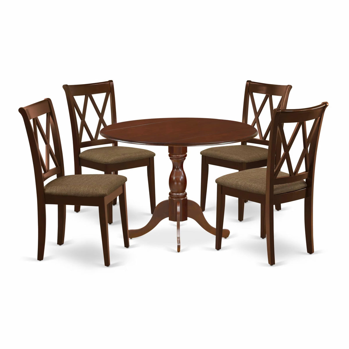 EAST WEST FURNITURE - DMCL5-MAH-C - 5-PC WOOD DINING TABLE SETThe 5-piece kitchen table set is a premium addition to any dining room. This set comprises a drop leaves wooden dining table and 4 matching wood dining chairs, which exude an air of elegance and sophistication. The modern design is seamlessly compatible with any interior decor, and the contemporary double X-back of the wooden kitchen chair blends impeccably with the linen fabric seat, adding a touch of refinement to the overall appearance. The dining chairs are not only aesthetically pleasing but also incredibly comfortable, featuring a soft linen fabric seat with spring support and a well-padded cushion. The solid natural wood frame of the chairs adds to their quality and design, ensuring they are both durable and stylish. The mahogany color of the chairs complements the dining table, which boasts a classical style and a spacious tabletop made of high-quality rubber wood material, adding to its durability and longevity. The dining table set is also easy to assemble, with clear instructions and all necessary tools provided. The smooth brush finish of the furniture allows for effortless cleaning with a damp cloth and furniture cleanser, making maintenance hassle-free. In summary, the East West Furniture 5-piece kitchen table set offers a perfect blend of quality, design, and comfort, making it an excellent choice for any discerning homeowner.PRODUCT FEATURES: Seat Material: Linen Fabric Color: Mahogany Chair Back Style: Double X-Back Dimension of Table: Length: 42; Width: 42; Height: 29.5. Chair Dimension: Length: 22; Width: 18; Height: 37.Include in the Package: 4 Dining Chairs and 1 Dining Table.