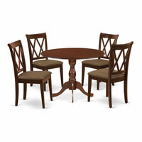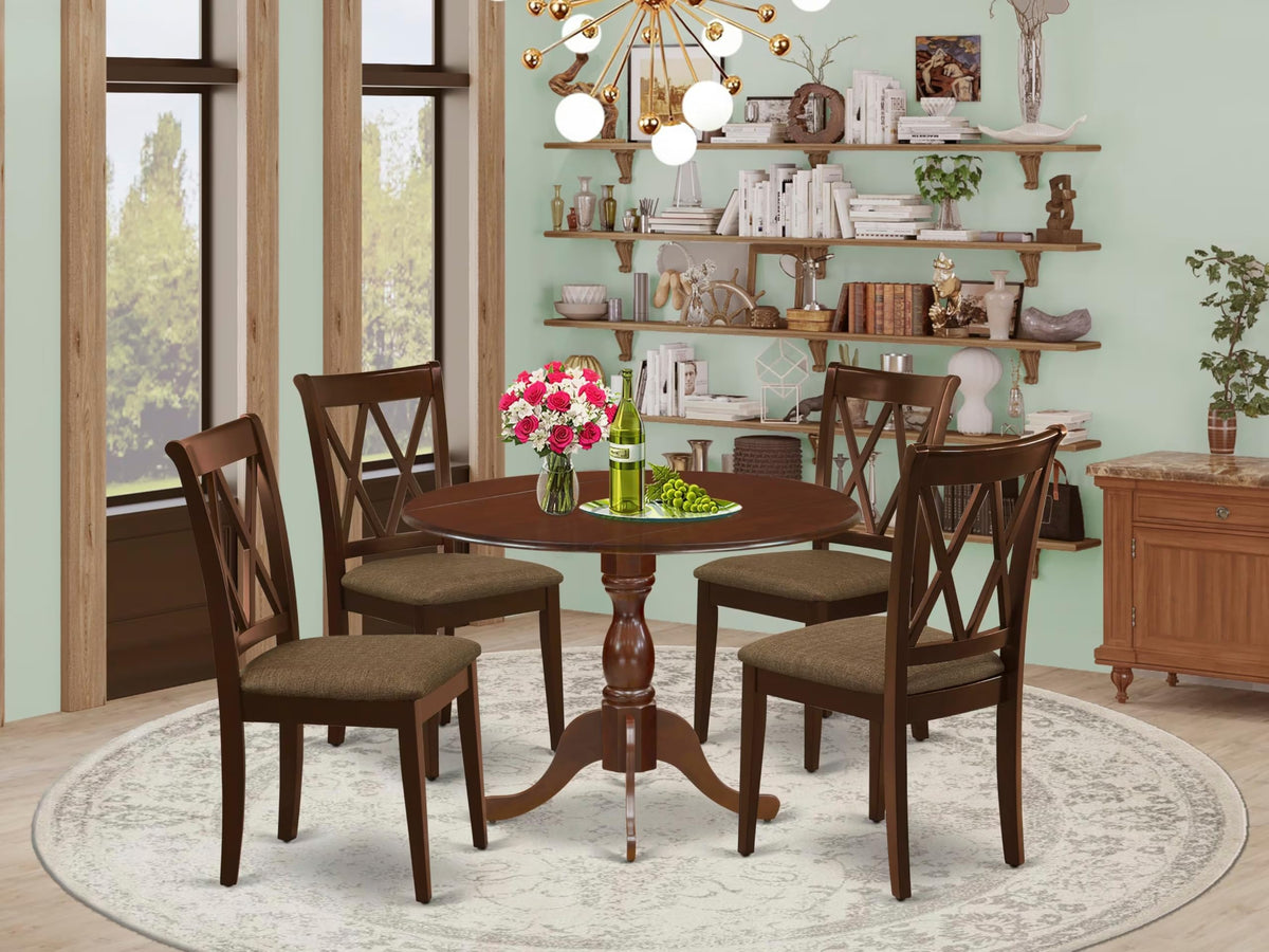 East West Furniture DMCL5-MAH-C 5 Piece Kitchen Table Set for 4 Includes a Round Dining Table with Dropleaf and 4 Linen Fabric Dining Room Chairs, 42x42 Inch, Mahogany